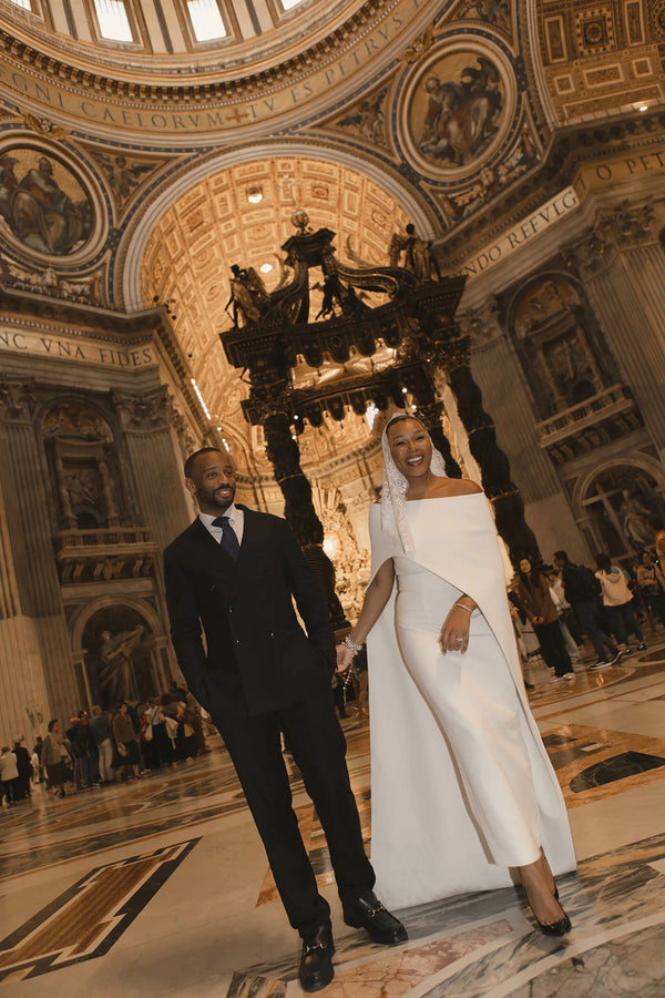 In Rome, TK Crooks-Nwokedi and Chuba Nwokedi celebrated their wedding day with a look defined by precision and intention. For the ceremony, TK chose a custom Safiyaa gown that reflected a contemporary bridal vision through clean structure, sculpted lines and an understated sense of presence.