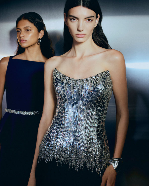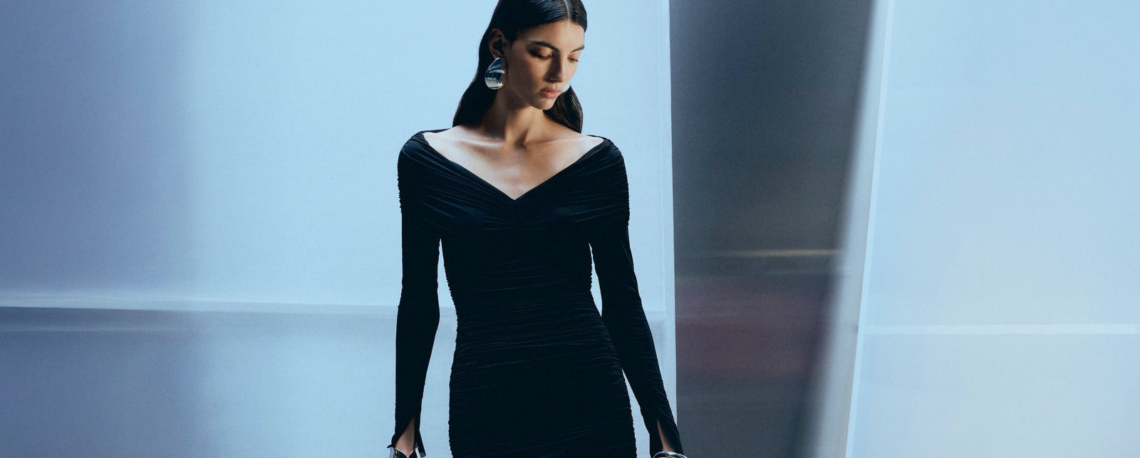 Textures and tones reflect the spirit of the season: lustrous satin, radiant crepe and metallic embroidery that glows under candlelight. From sculpted gowns to sparkling cocktail dresses and sharply cut separates, the collection transforms dressing up into an art form.