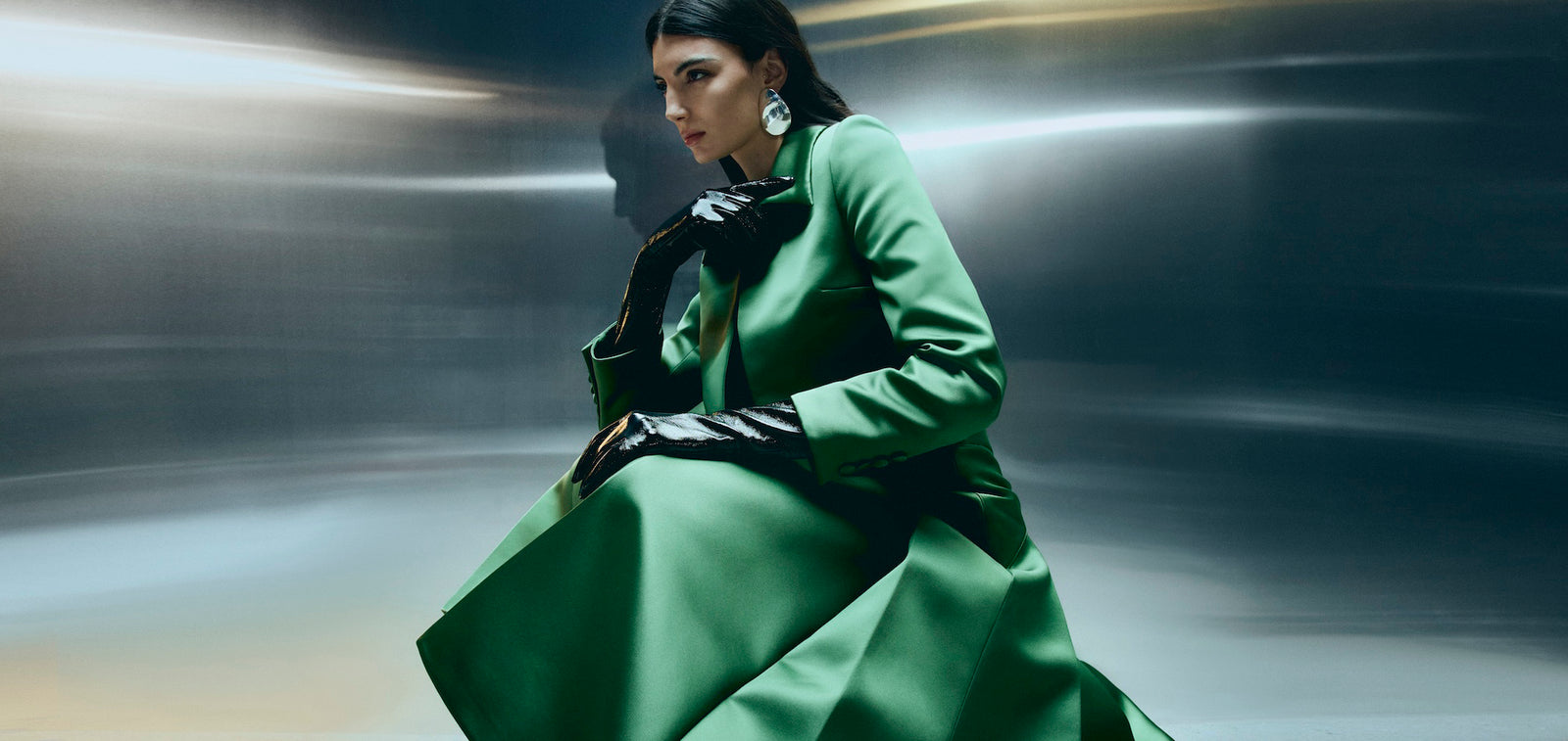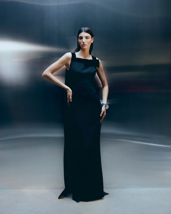 Resort ‘26 is a dialogue between light and shadow, now reframed through an autumnal lens. Vivid reds and deep maritime blues bring warmth to the season, their tones intensified against sculpted black dresses and moss-green tailoring. Draped midis, structured gowns, and sharp separates define the collection’s duality: pieces composed with precision yet made to move, with highlights including evening dresses for autumn events.