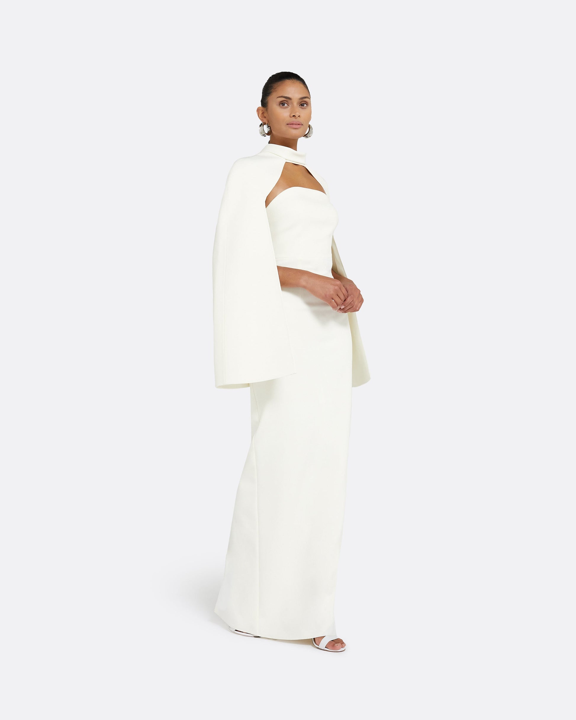 High neck harness with caped sleeve and back bolero in ivory.