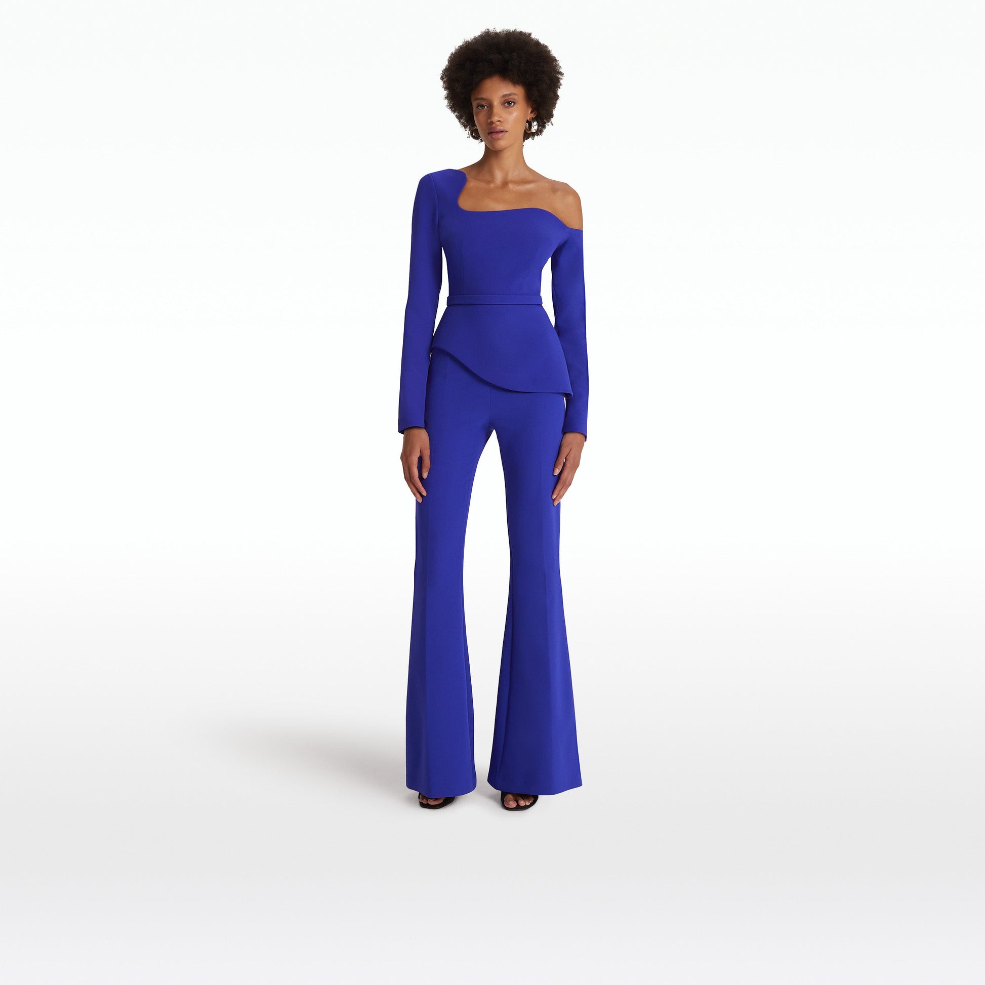 A Safiyaa Icon, the Aime top in azure blue brings sculptural clarity to modern dressing. Defined by its asymmetric neckline and softly flared silhouette, it offers a poised, architectural presence.