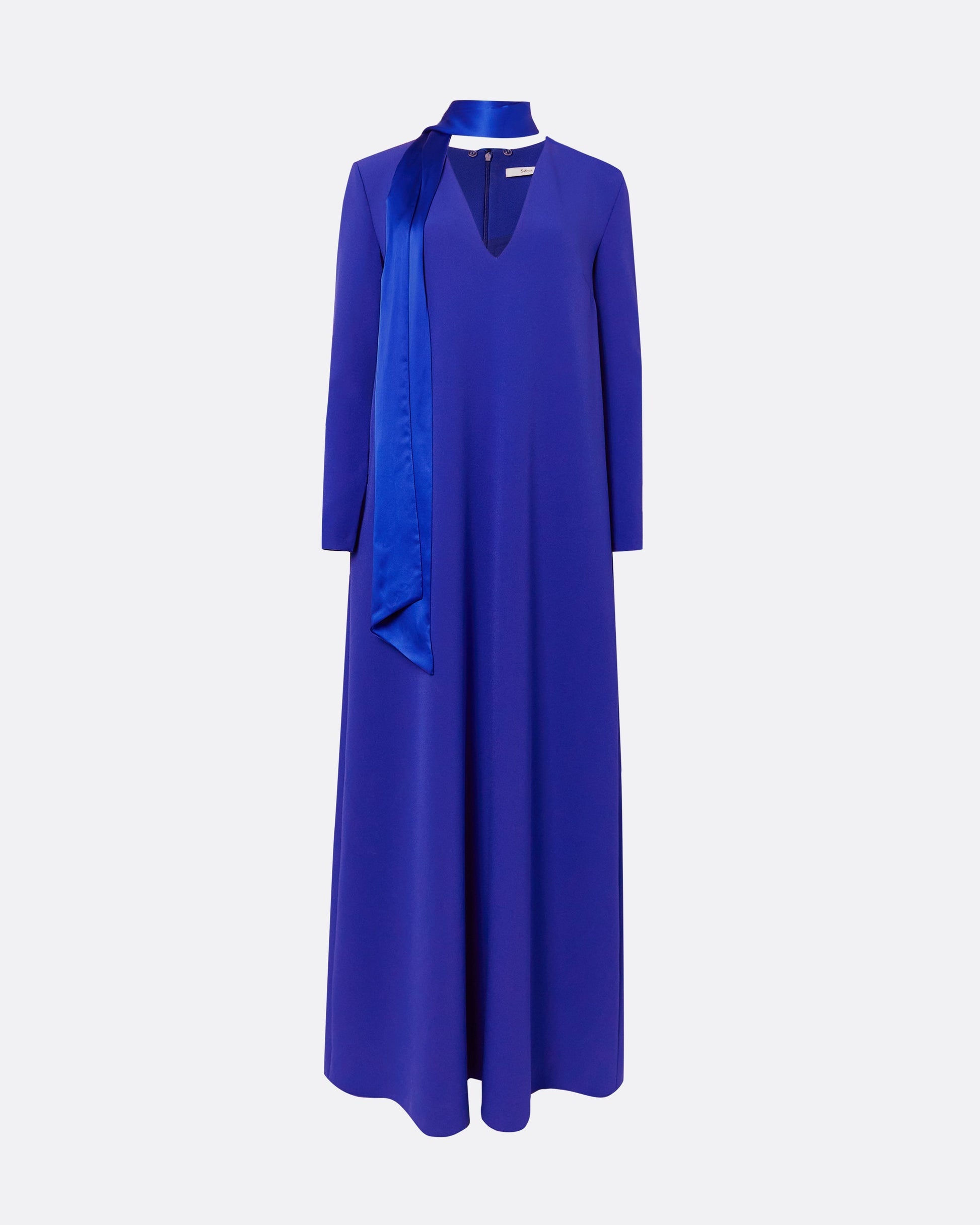 Long sleeve, V-neck, A-shaped long dress with removable shawl collar detail in azure blue.