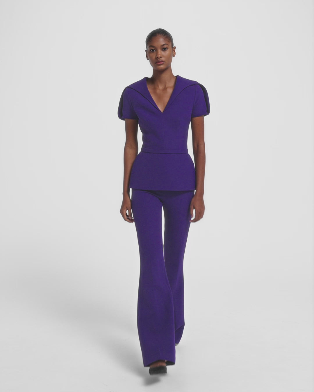 From the Resort '26 collection, the Alexa trousers in pansy present a bold, modern statement. With their expressive silhouette and distinctive flared legs, they are designed to transition seamlessly from day to evening.