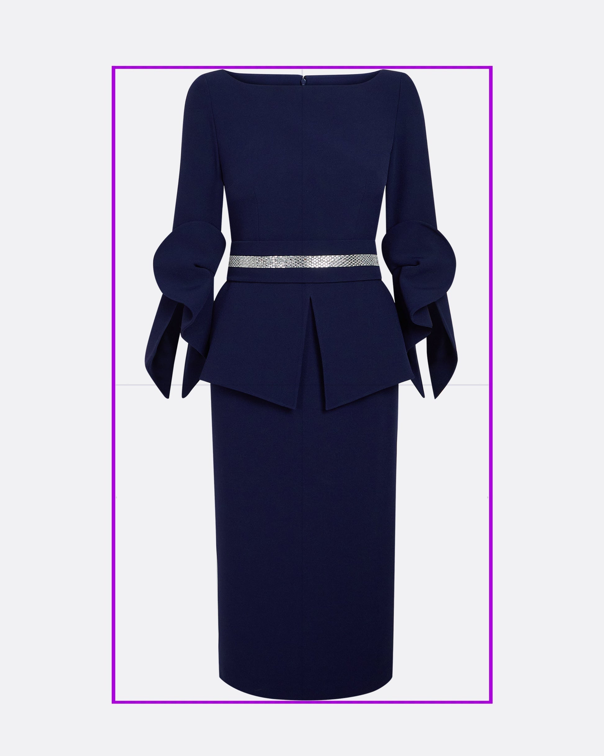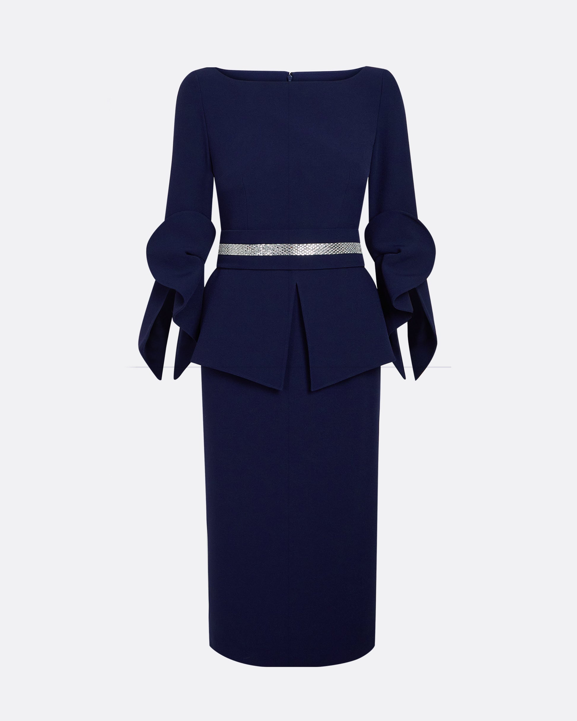 Azurite Blue boat neck dress with split peplum, heliconia draped sleeve and silver Crystal Serpent embroidery.