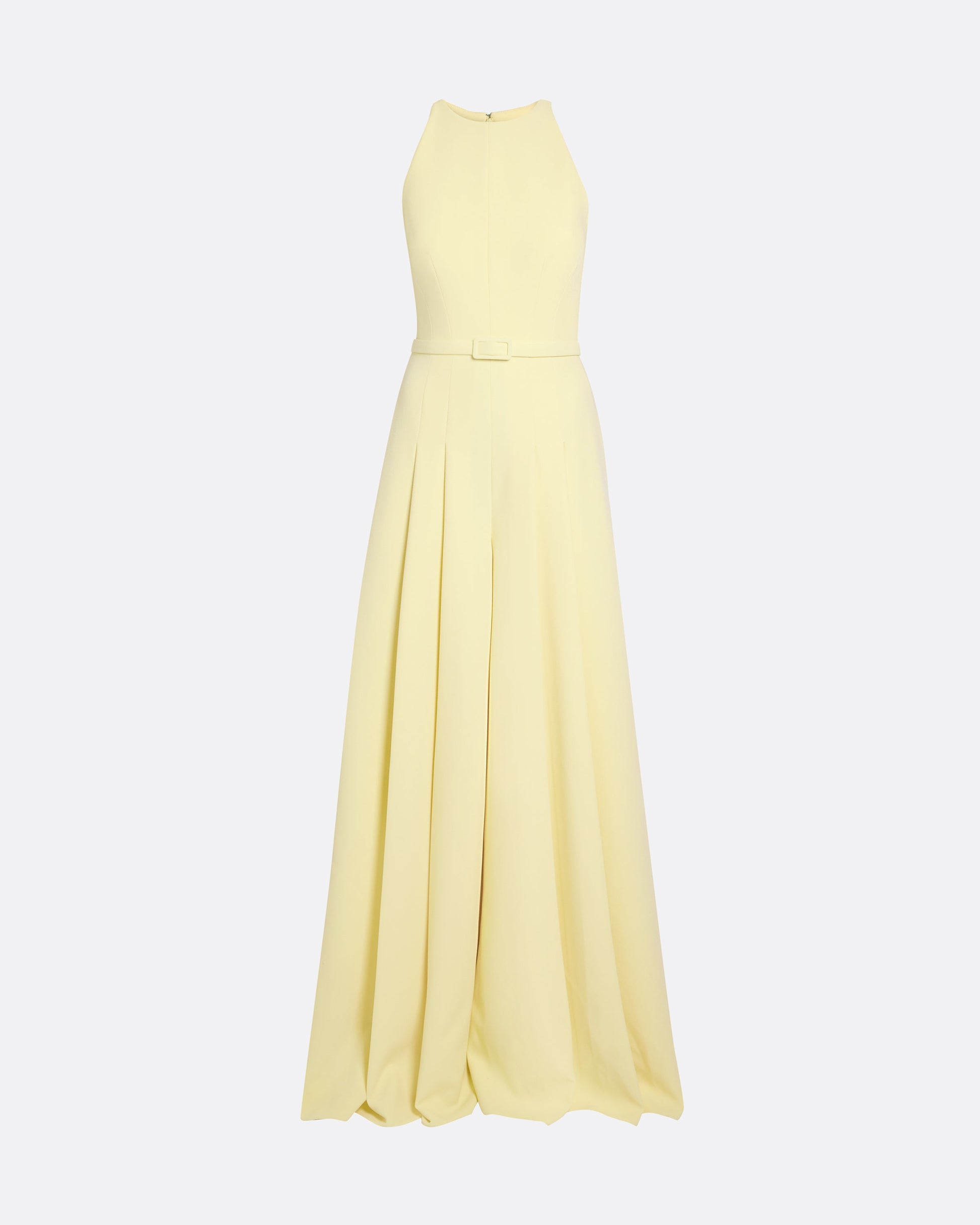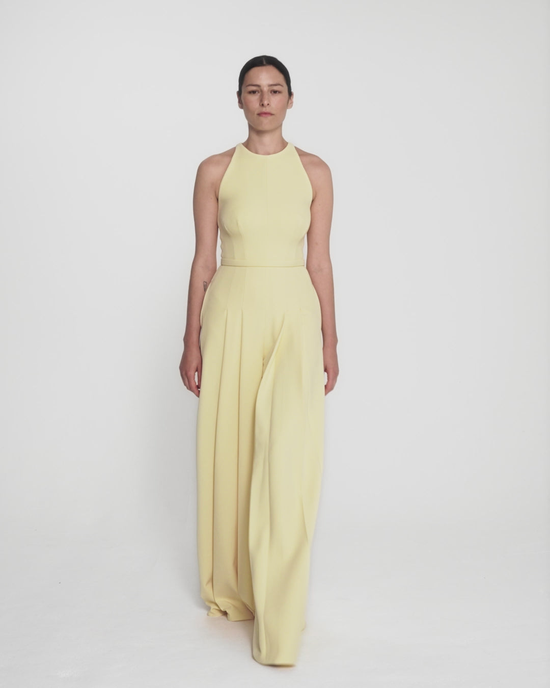 From the Spring Summer ’26 collection, the Althea jumpsuit and Jonia belt in pale yellow merge the ease of tailoring with a softened, feminine mood. The halterneck cut is clean and minimal, while wide, pleated legs create the effect of a flowing skirt in motion. A tonal Jonia belt defines the waist.