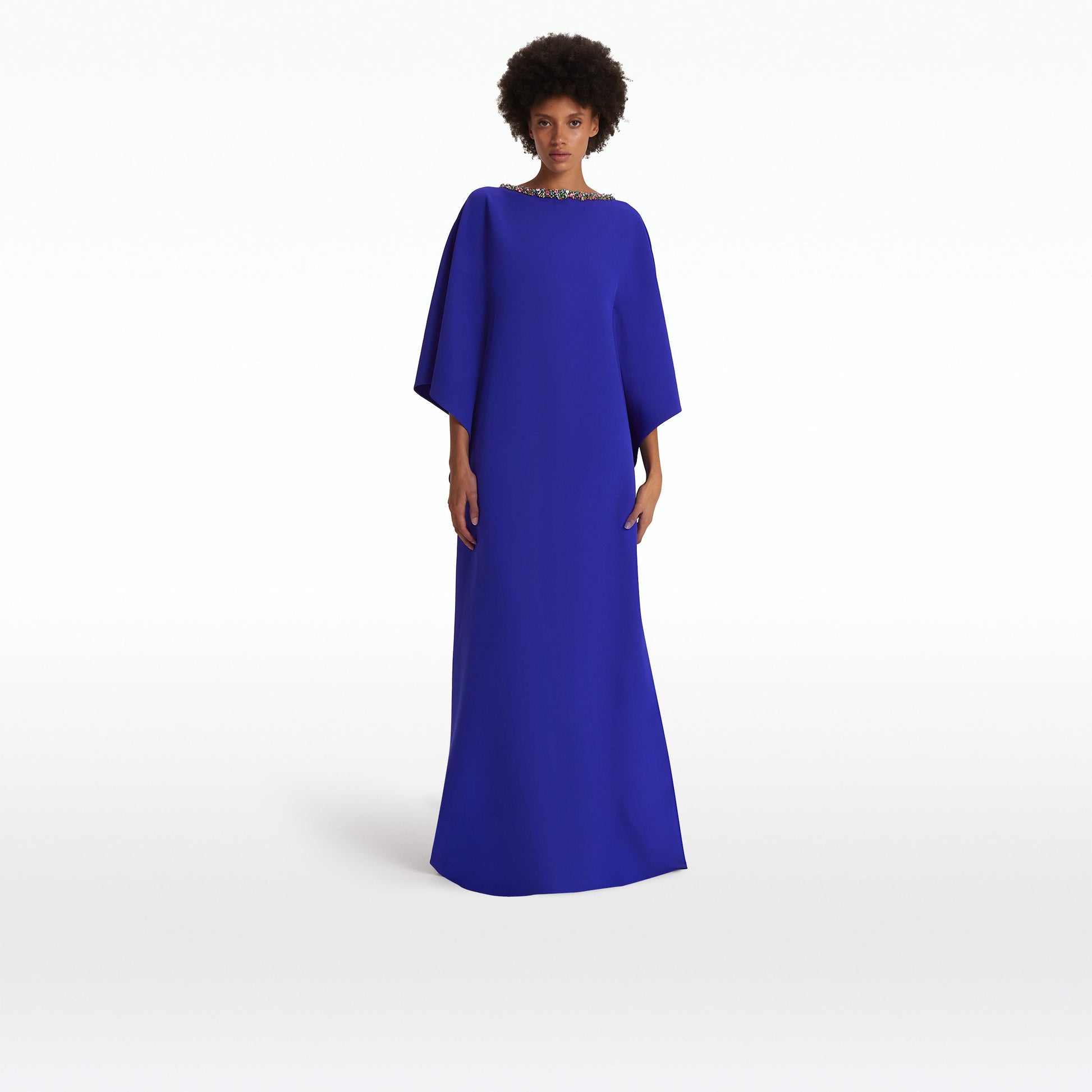 Flowing kaftan gown with flattering seam detail in azure blue Heavy Crepe with multi-brights Crystal Trim B.