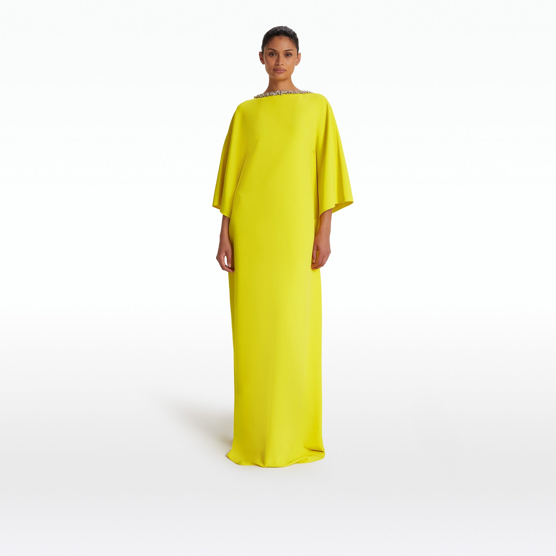 Flowing kaftan gown with flattering seam detail in chartreuse Heavy Crepe, with crystal/smoke Crystal Trim B embroidery.