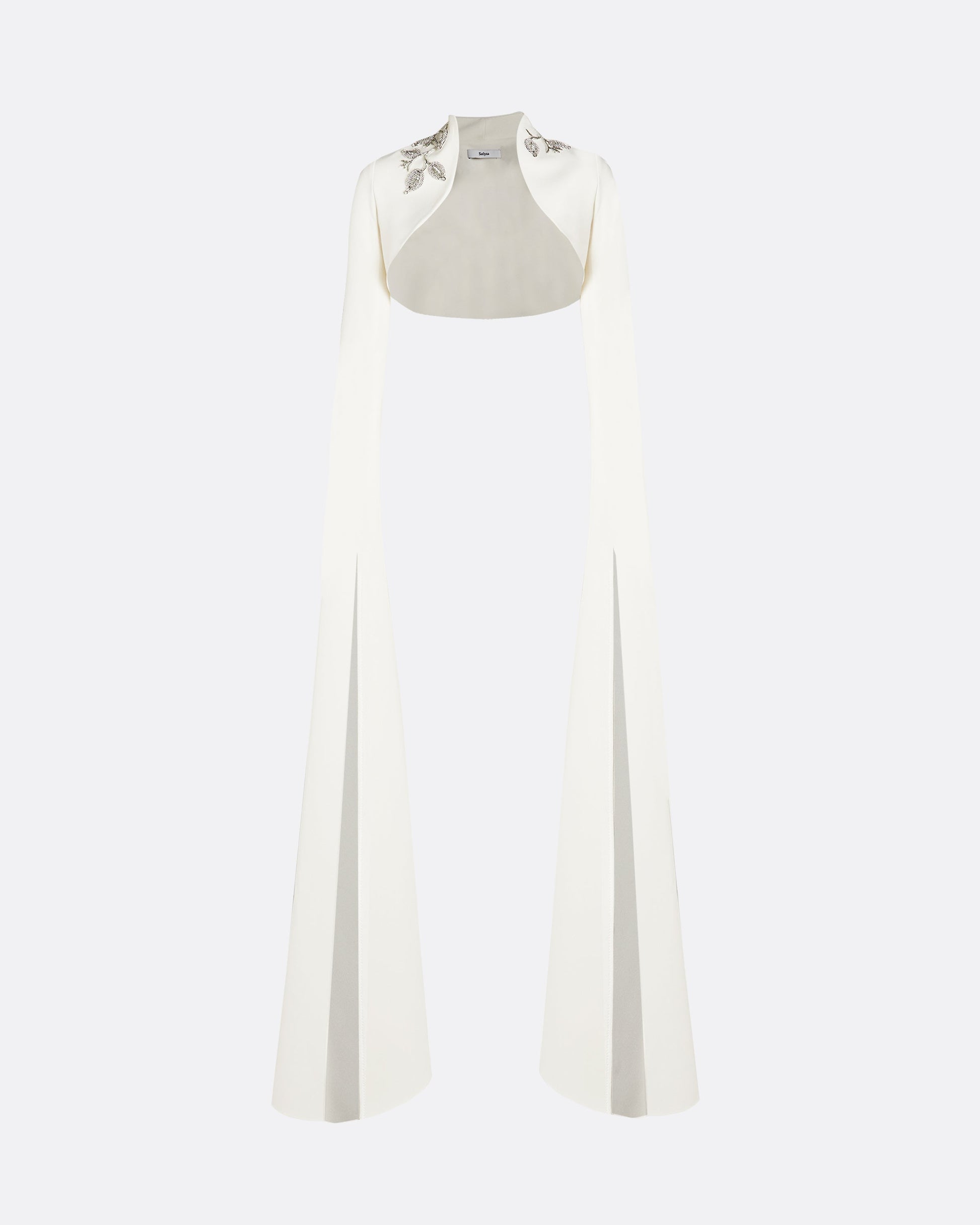 Raised collar bolero with floor length sleeve and Flower Bud embroidery, in ivory.