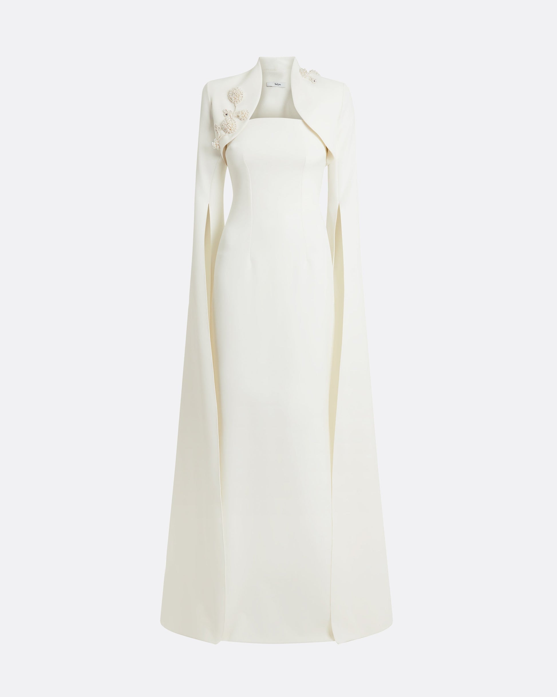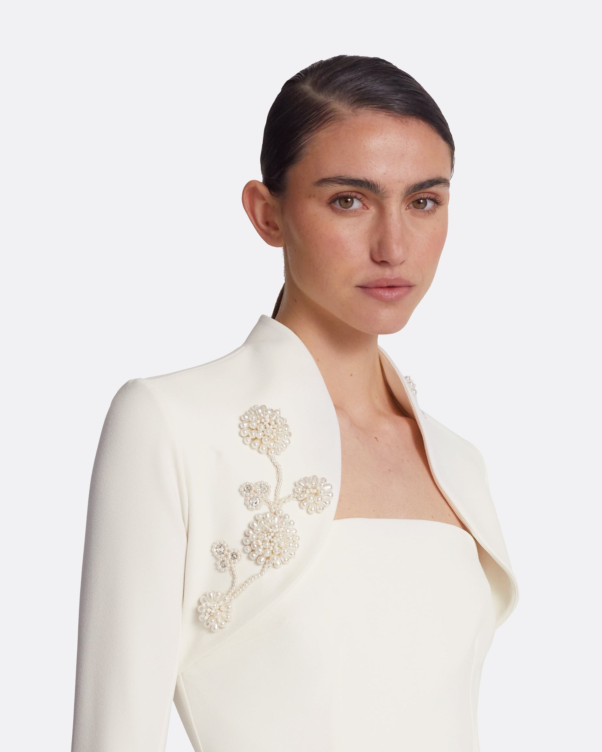 Raised collar bolero with floor length sleeves and separate bustier long dress, in ivory Heavy Crepe with pearl Carnation embroidery.