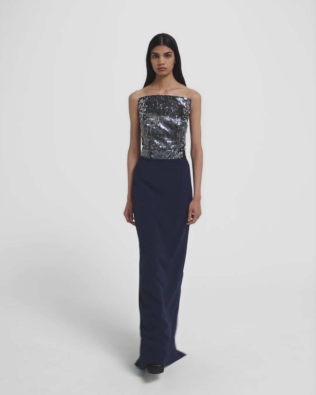 From the Resort ’26 collection, the Amory gown in maritime blue balances architectural clarity with evening allure. A square neckline frames the shoulders, while the fitted bodice glows with silver sequin embellishment that continues into a tonal belt, accentuating the waist.