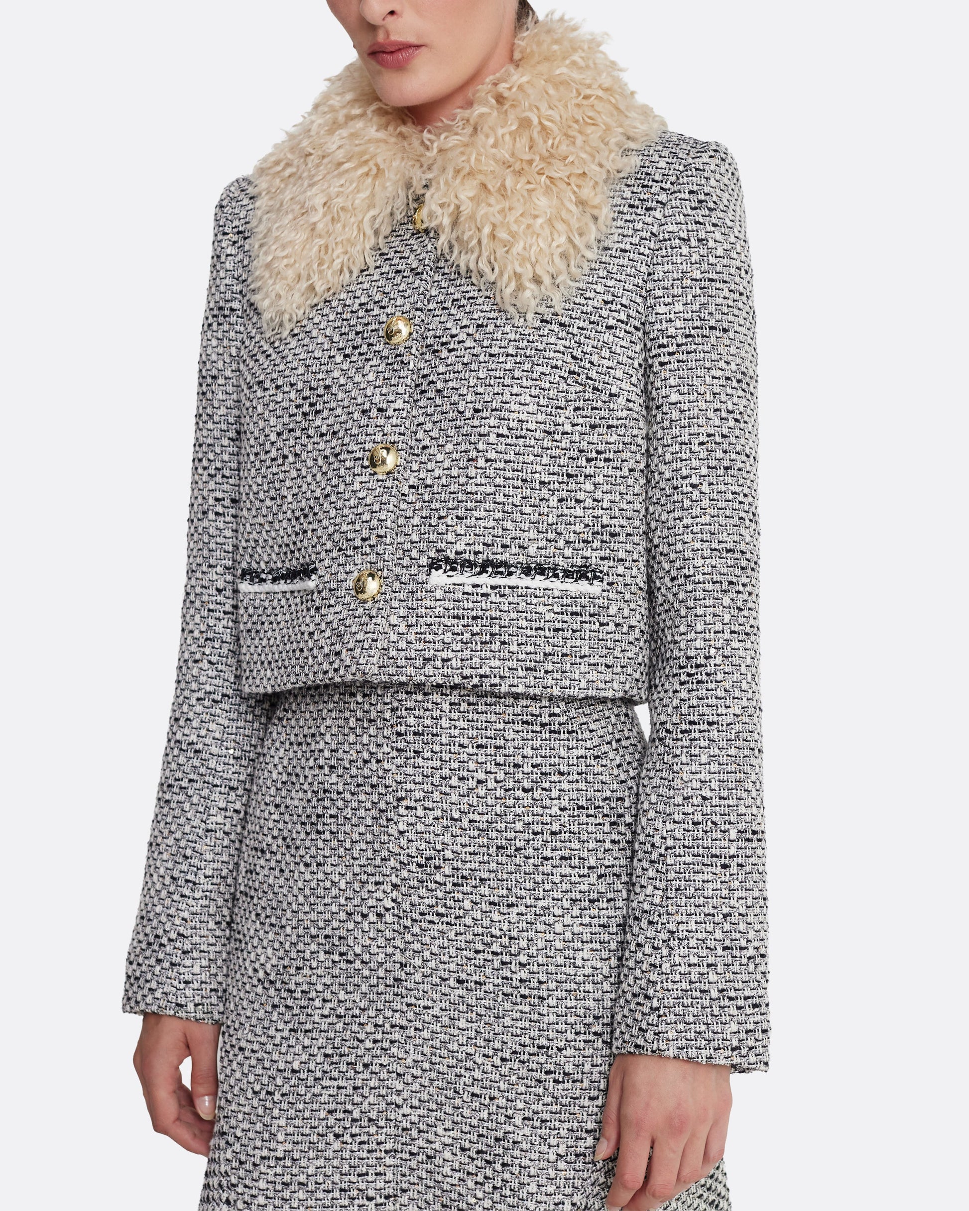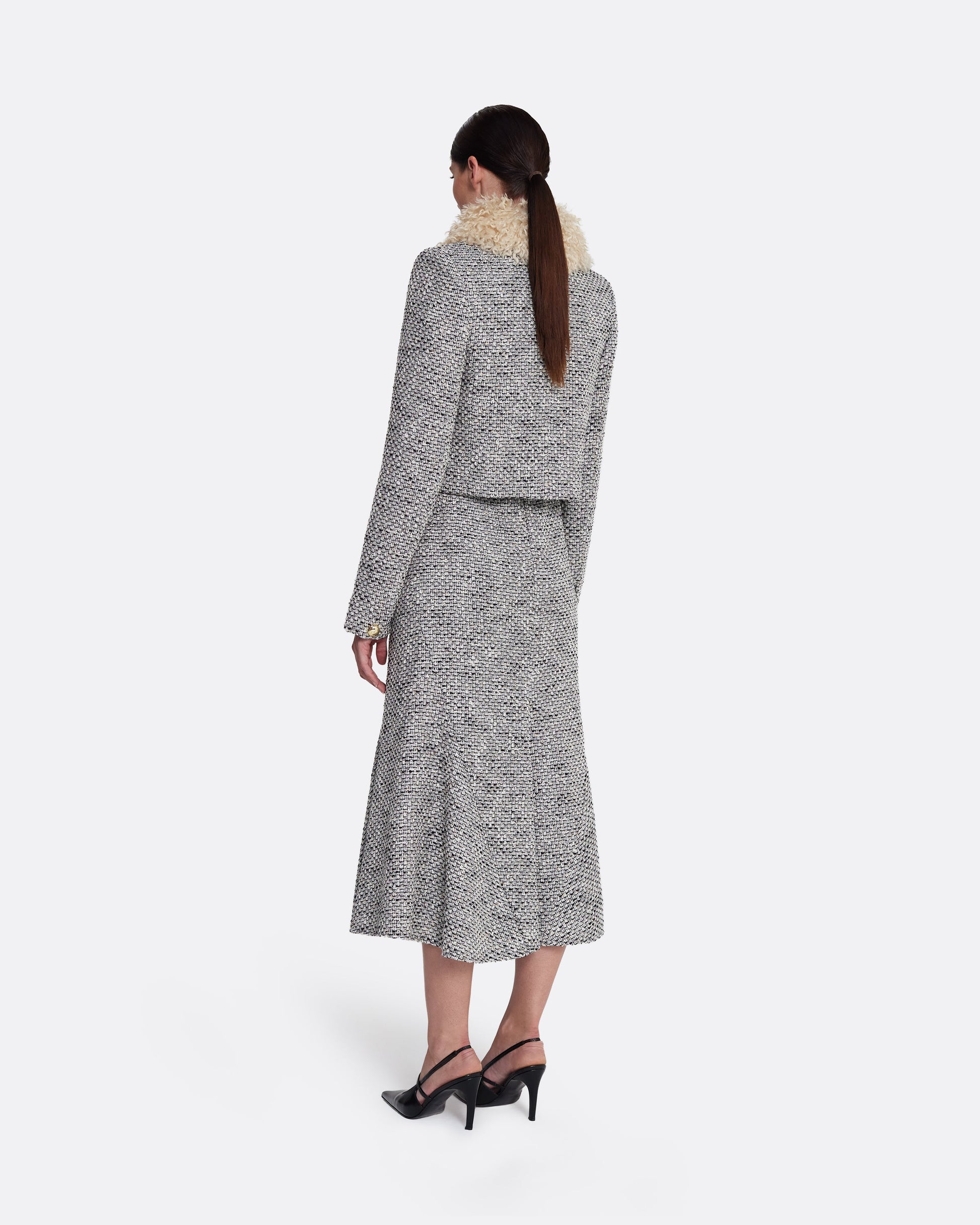 From the Spring Summer ’26 collection, the Annalisa Jacket in greyscale offers a cropped interpretation of classic tailoring. Crafted in a textured weave with a soft contrast collar, it balances structure with softness, while gold-toned buttons introduce a subtle sense of polish.