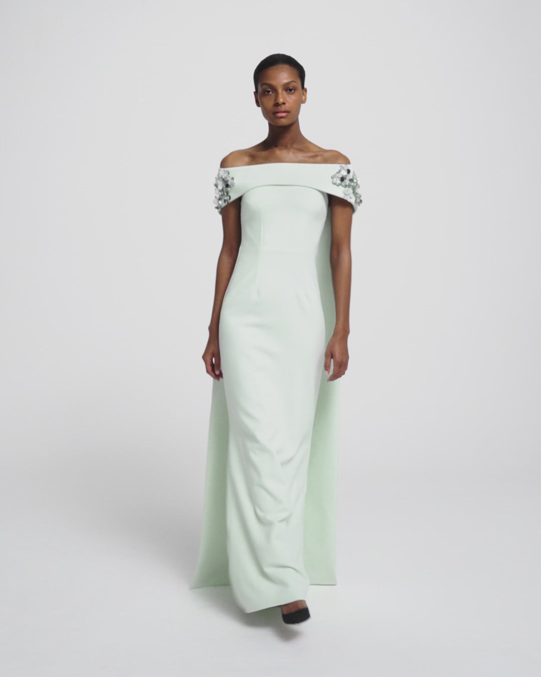 Off-the-shoulder harness in spearmint, adorned with silver Flora embroidery, with a long trailed back with a deep split. Combined with full-length fitted strapless dress in spearmint.