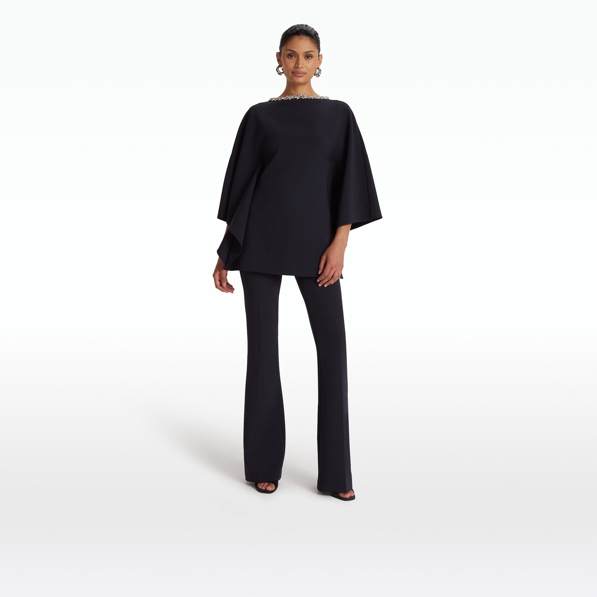 Flowing kaftan top with flattering seam detail in midnight navy Heavy Crepe with crystal-smoke Crystal Trim B.