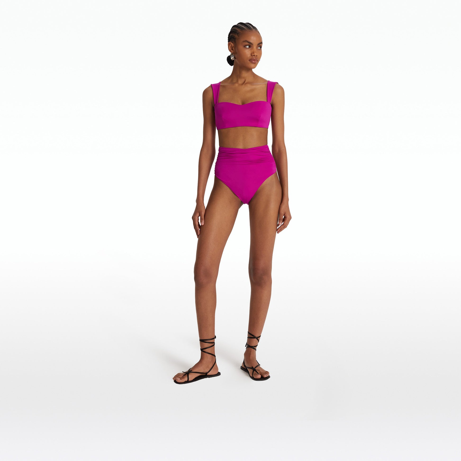 High waist bikini bottom with flattering gathers in magenta Vertigo Jersey.