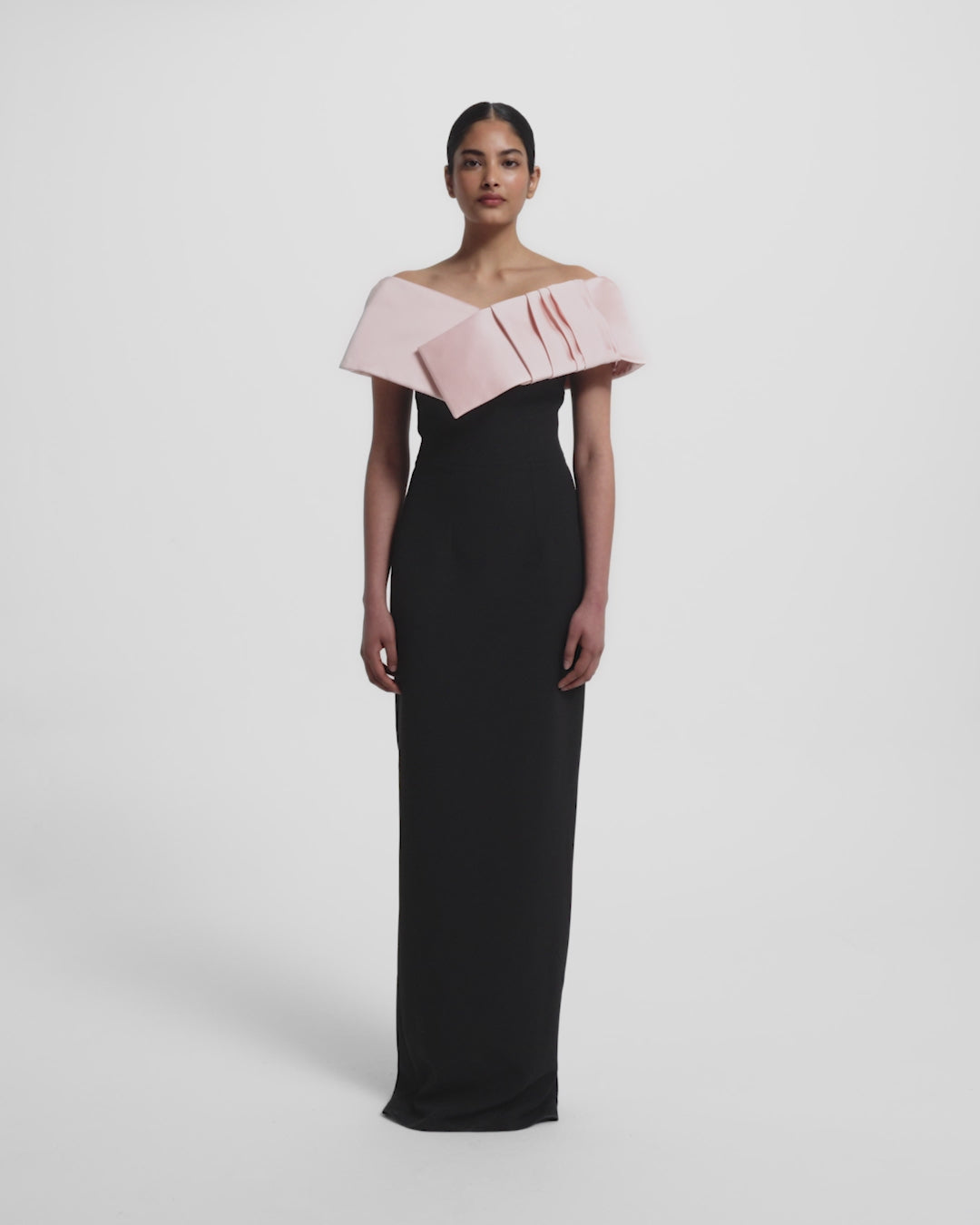 From the Autumn Winter '25 collection, the Azrael dress in black and Hanabi harness in lotus bloom combine graphic contrast with fluid construction. The off-shoulder drape introduces a sculptural layer over the streamlined base, creating a silhouette that feels both decisive and refined.