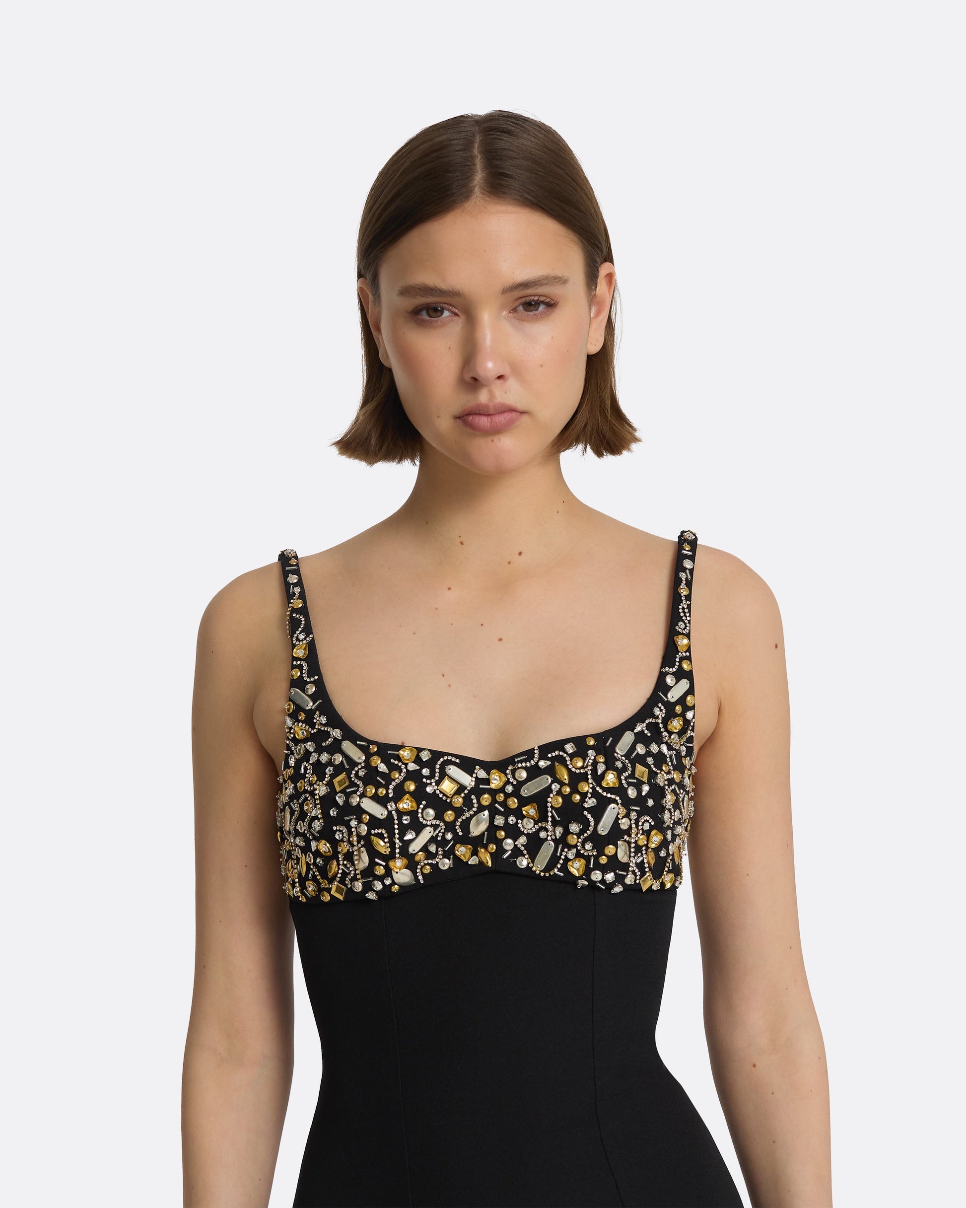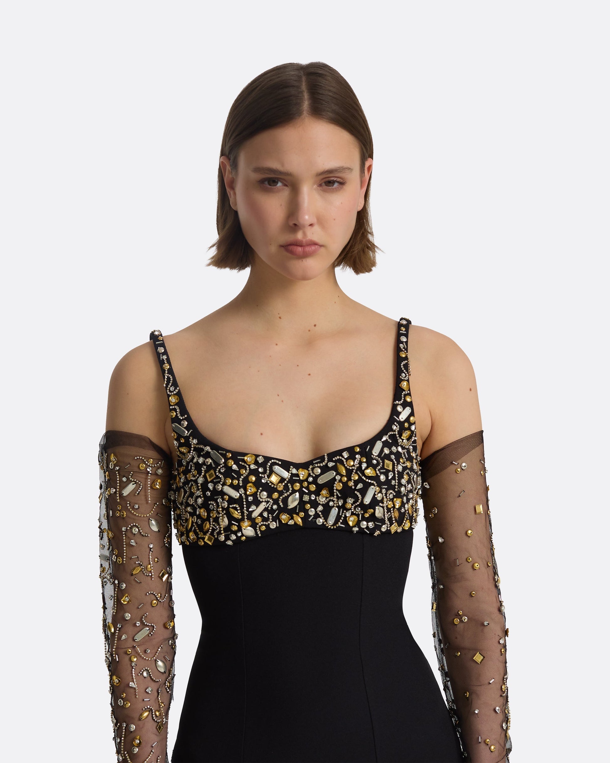 Styled with the Astin gloves in black and Celestial Scatter embroidery. Fits true to size. Model is 175cm | 5'9'' and wearing a FR36 Heavy Crepe: 92 % Polyester, 8 % Elastane
