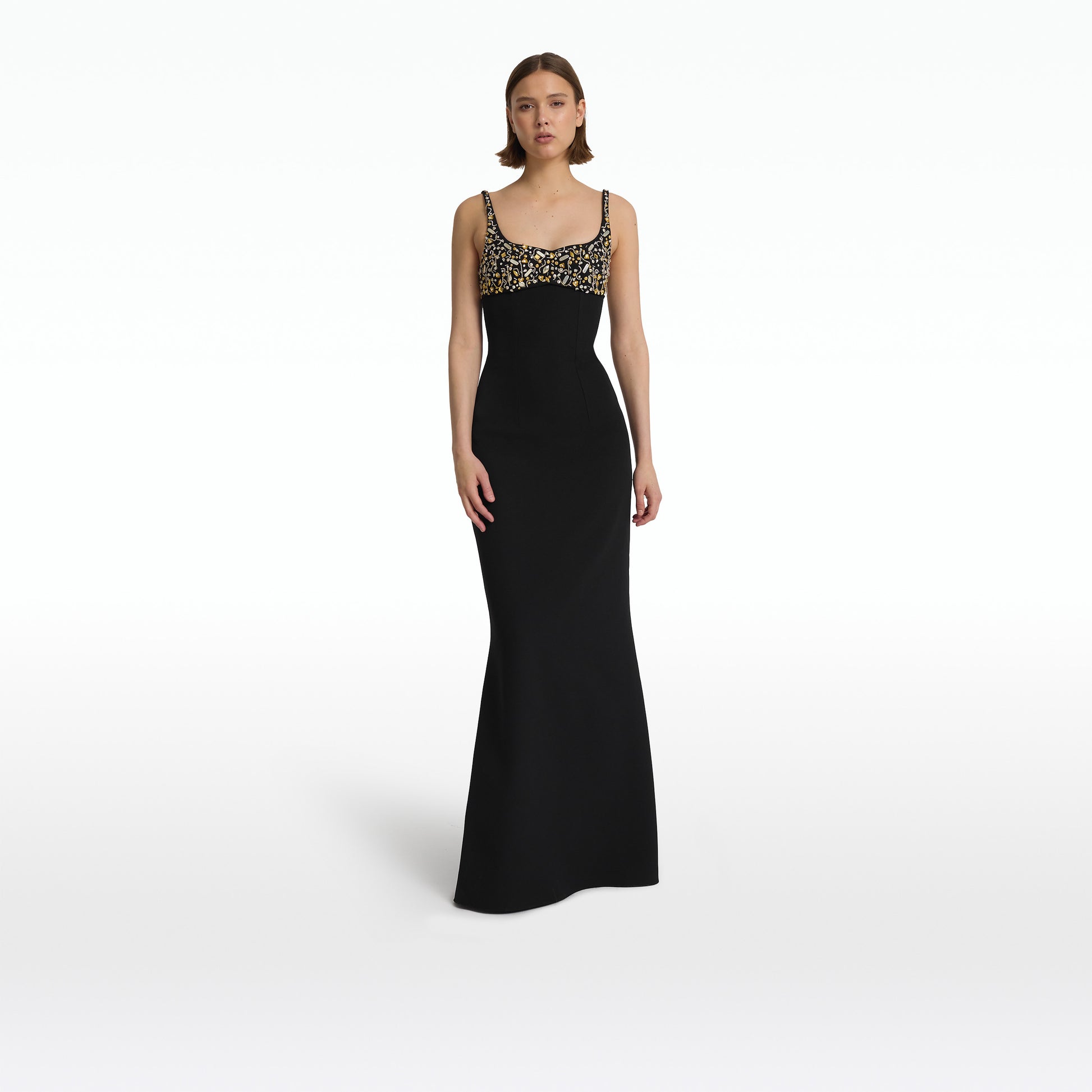Floor length, fishtail skirt gown with sweetheart neckline in black Heavy Crepe and Celestial Scatter embroidery.