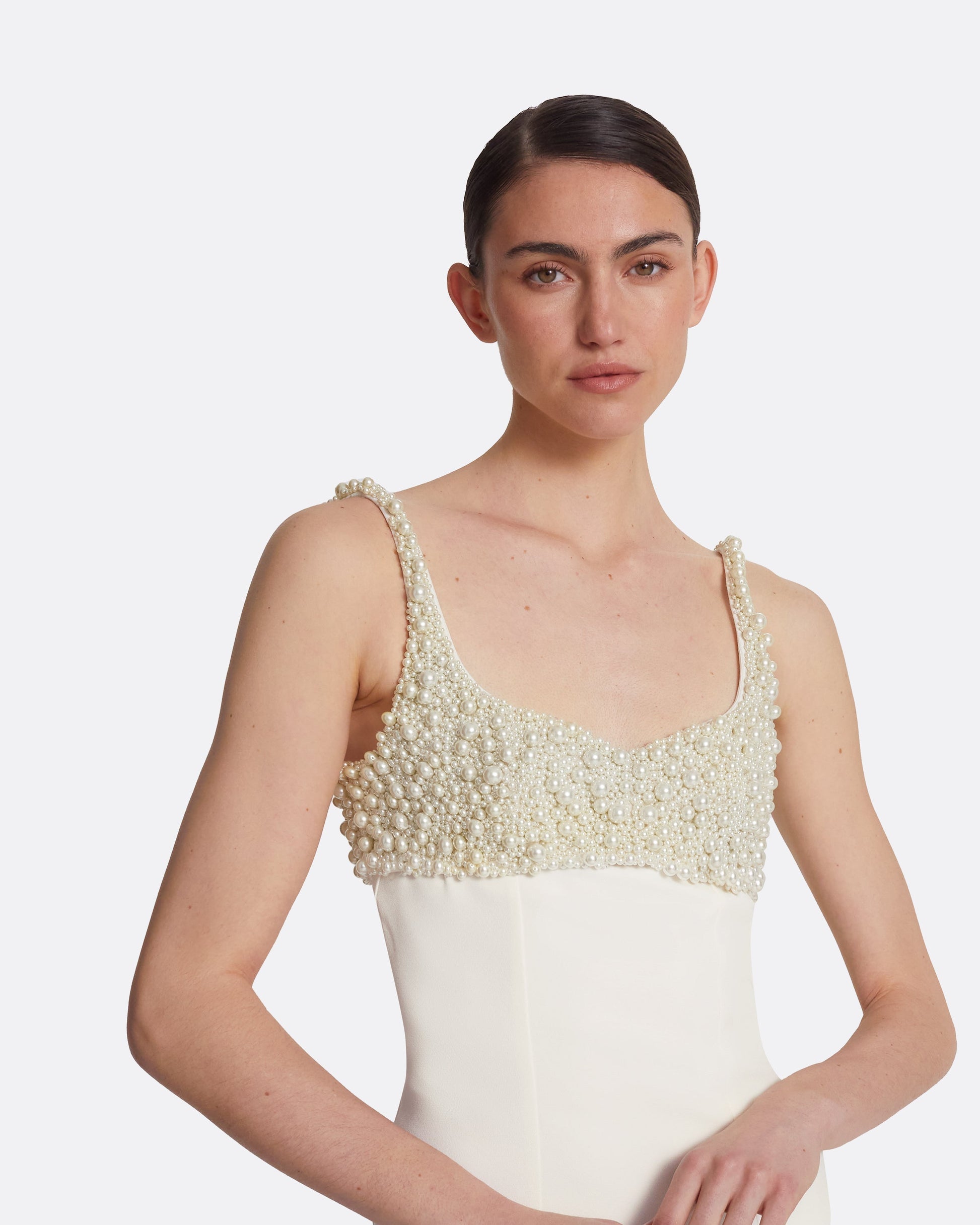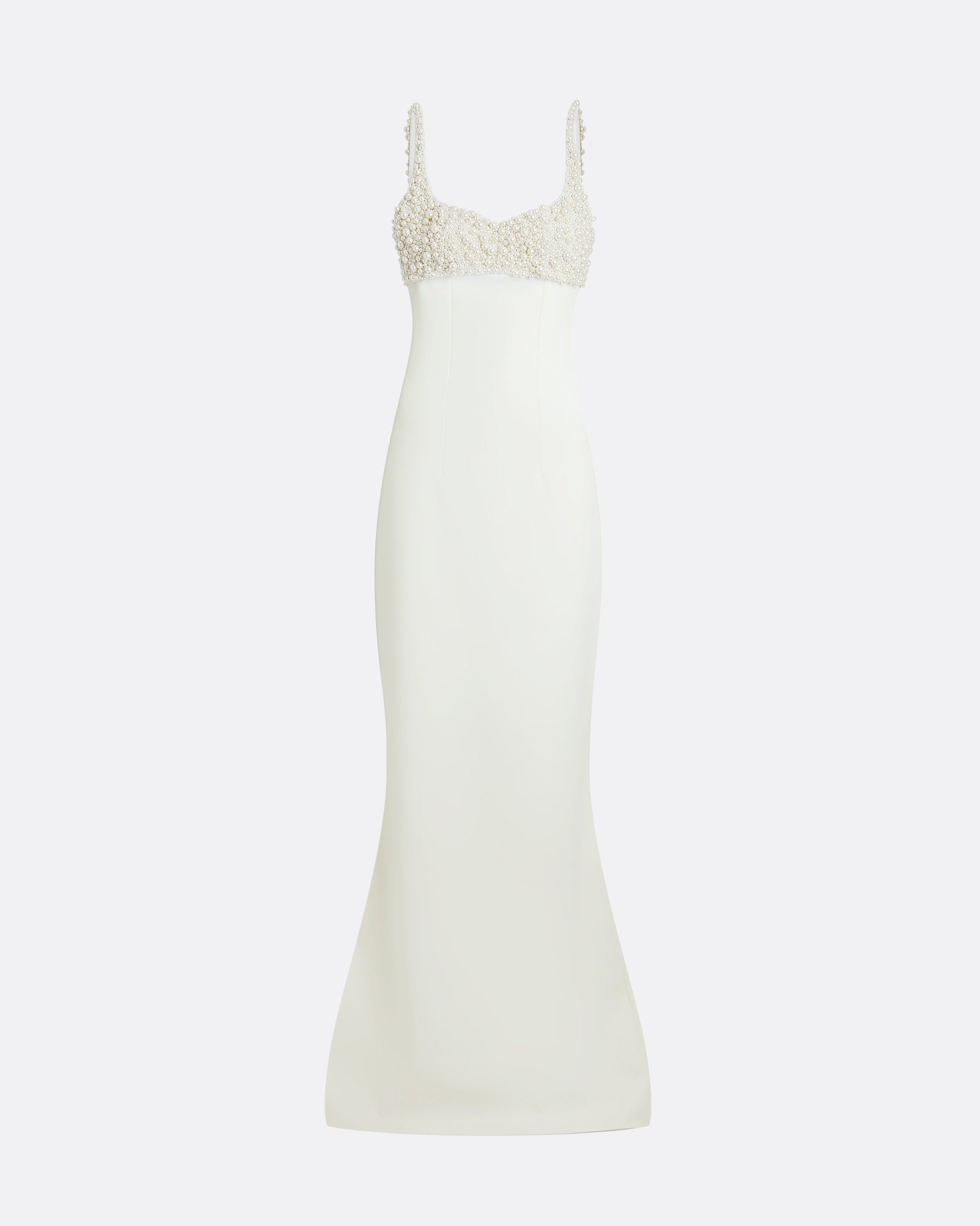 Floor length, column skirt gown with sweetheart neckline in ivory Heavy Crepe and Fleur embroidery.
