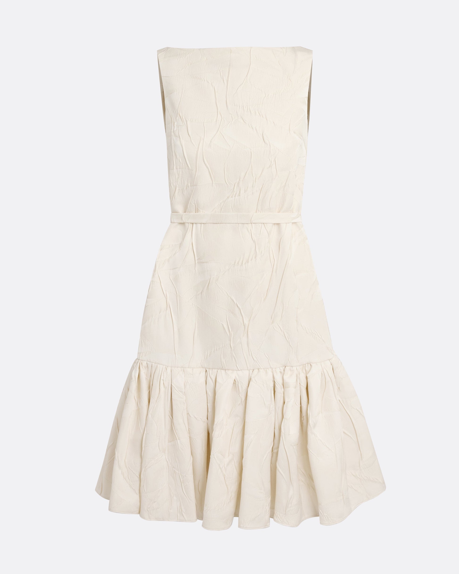 Baby doll, high neck mini dress with ruffle hem in ivory Ripple Jacquard.