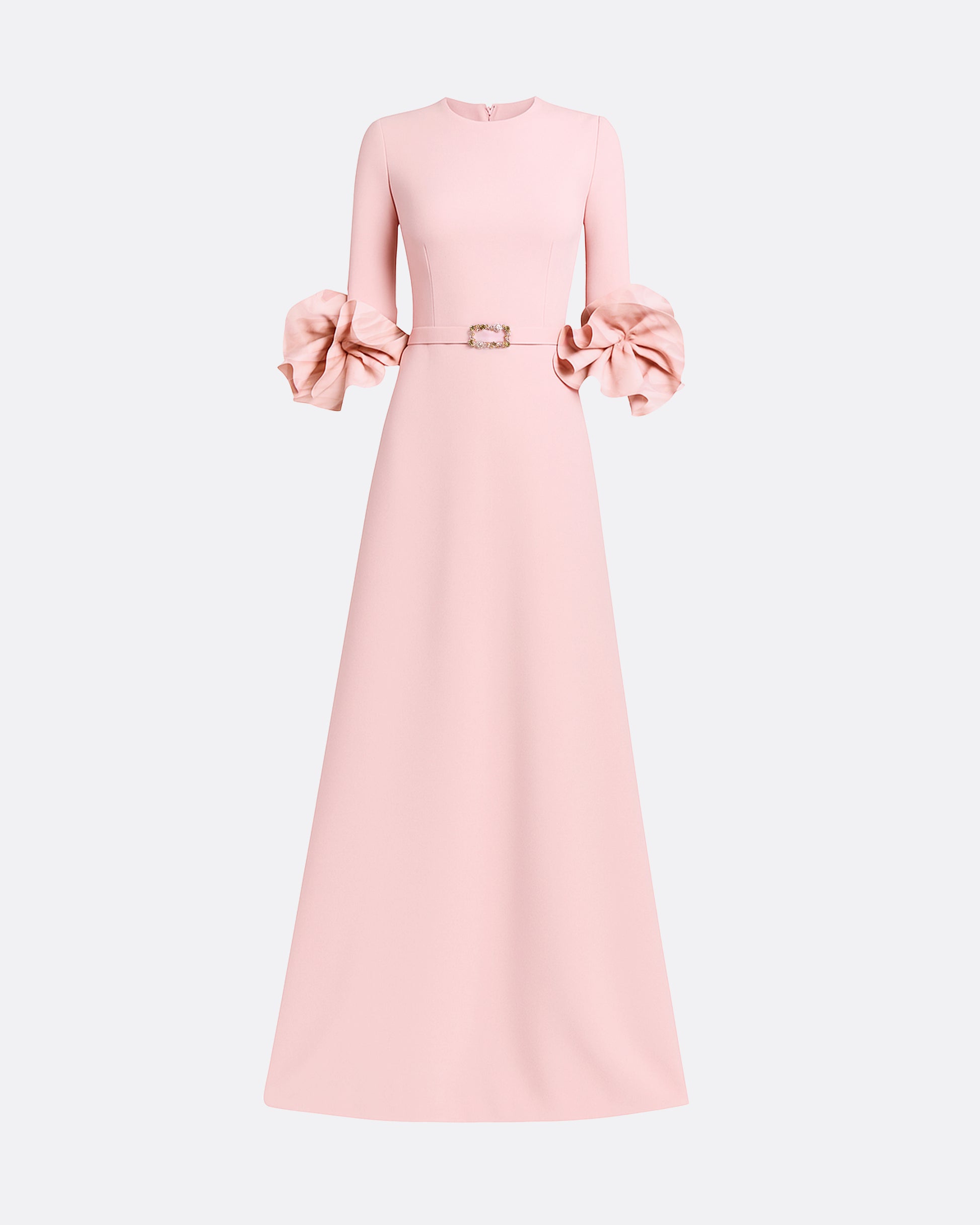 From the Pre-Fall '25 collection, the Belen dress in lychee is a study in refined contrast. Its flowing silhouette is complemented by sculptural accents, offering a commanding yet graceful presence.