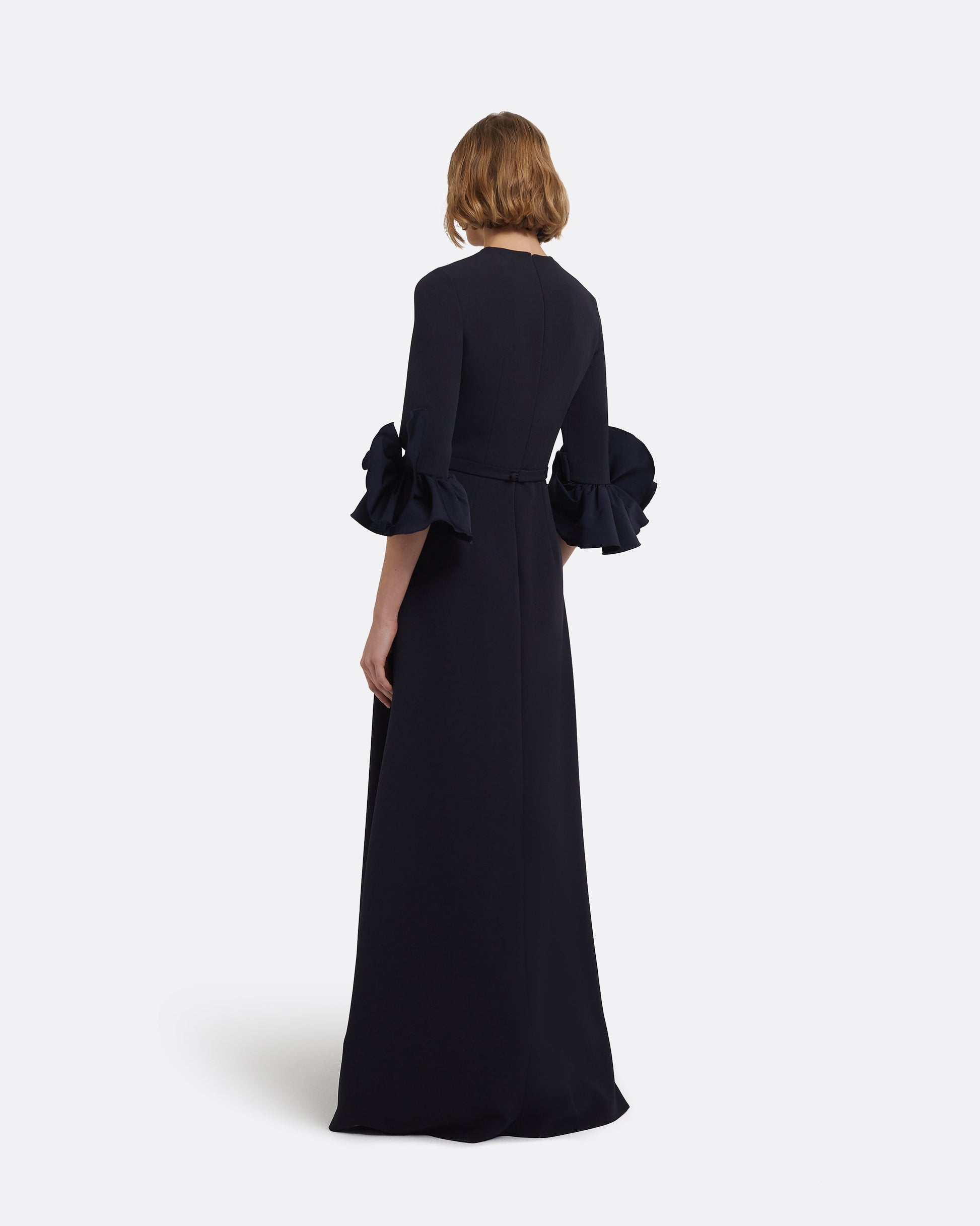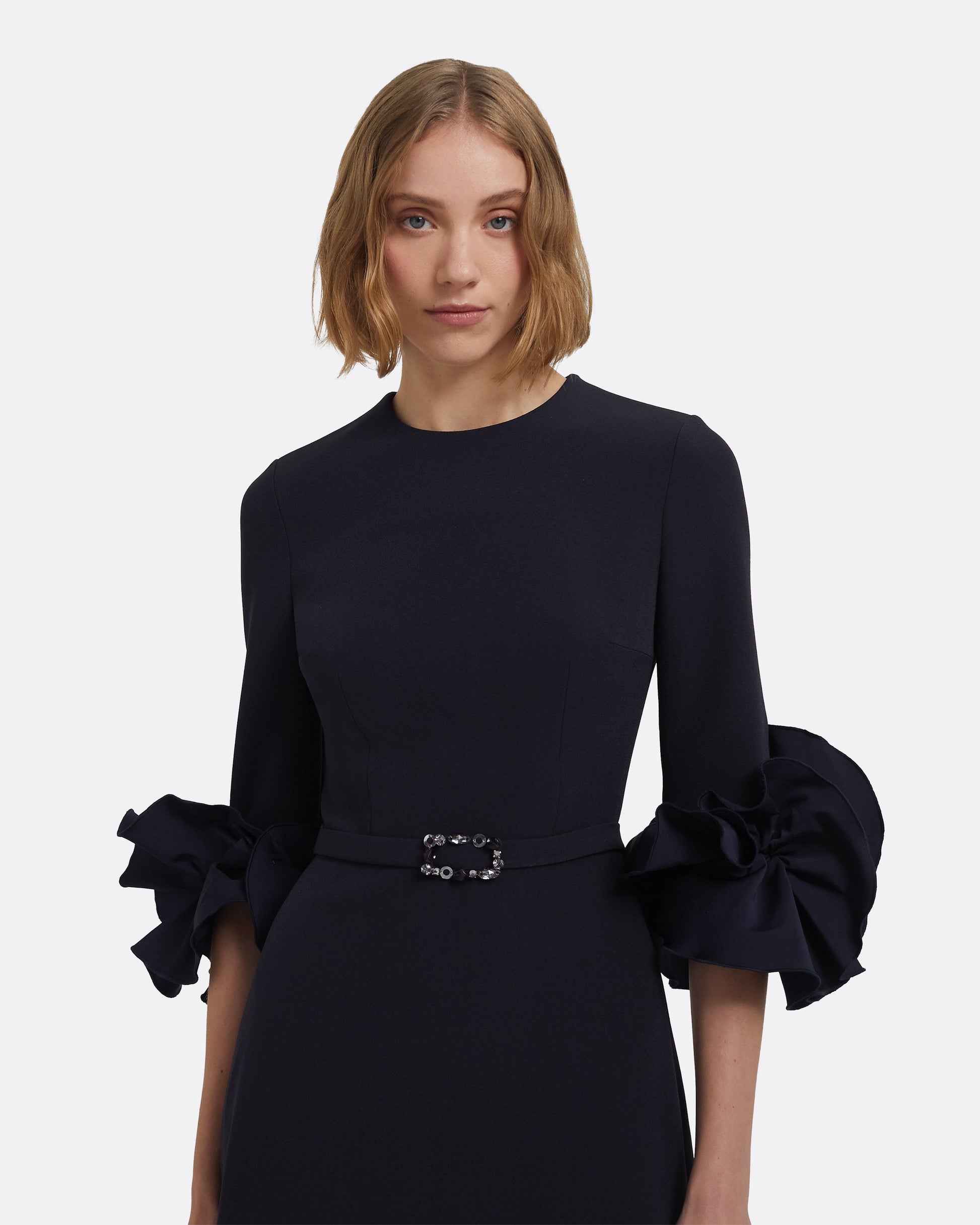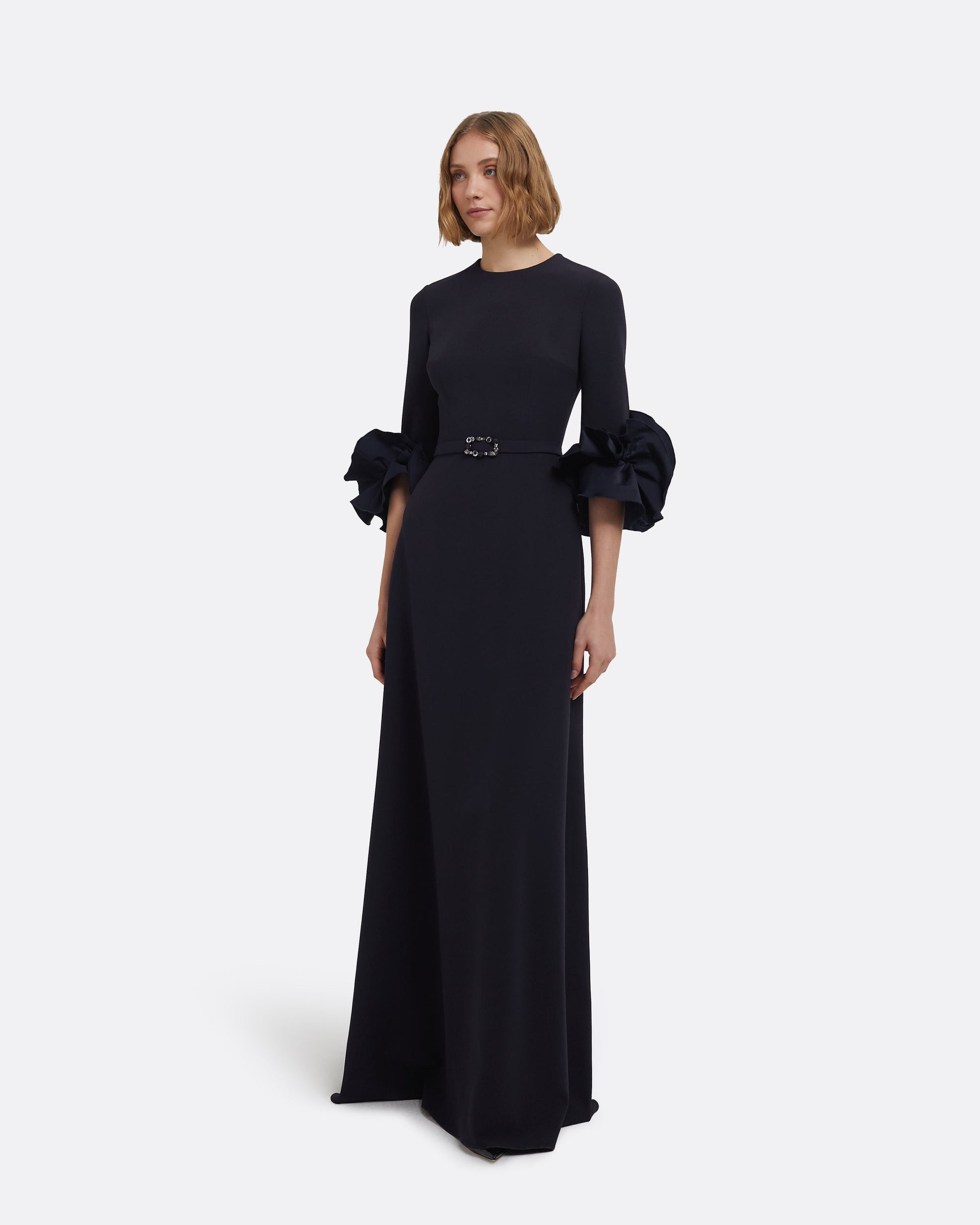 From the Pre-Fall '25 collection, the Belen dress in midnight navy is a study in refined contrast. Its flowing silhouette is complemented by sculptural accents, offering a commanding yet graceful presence.