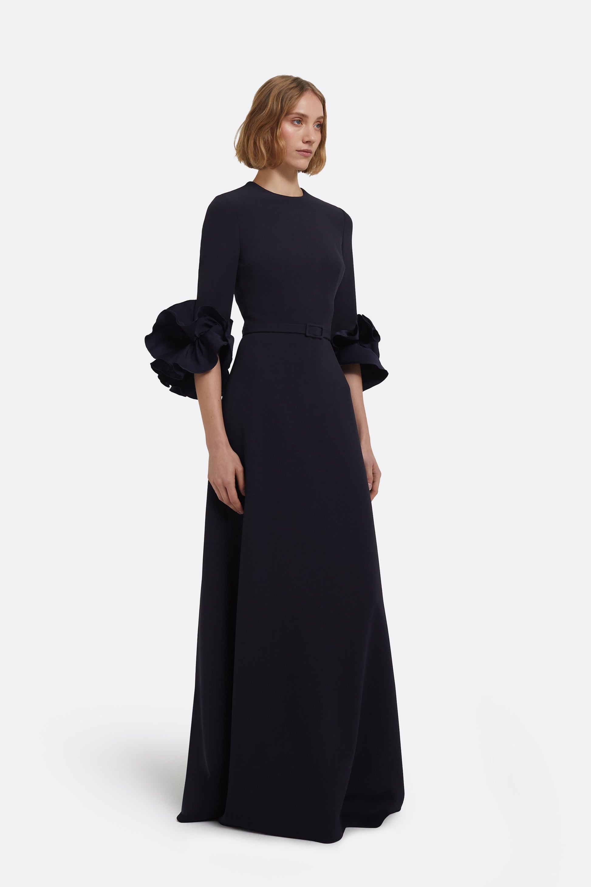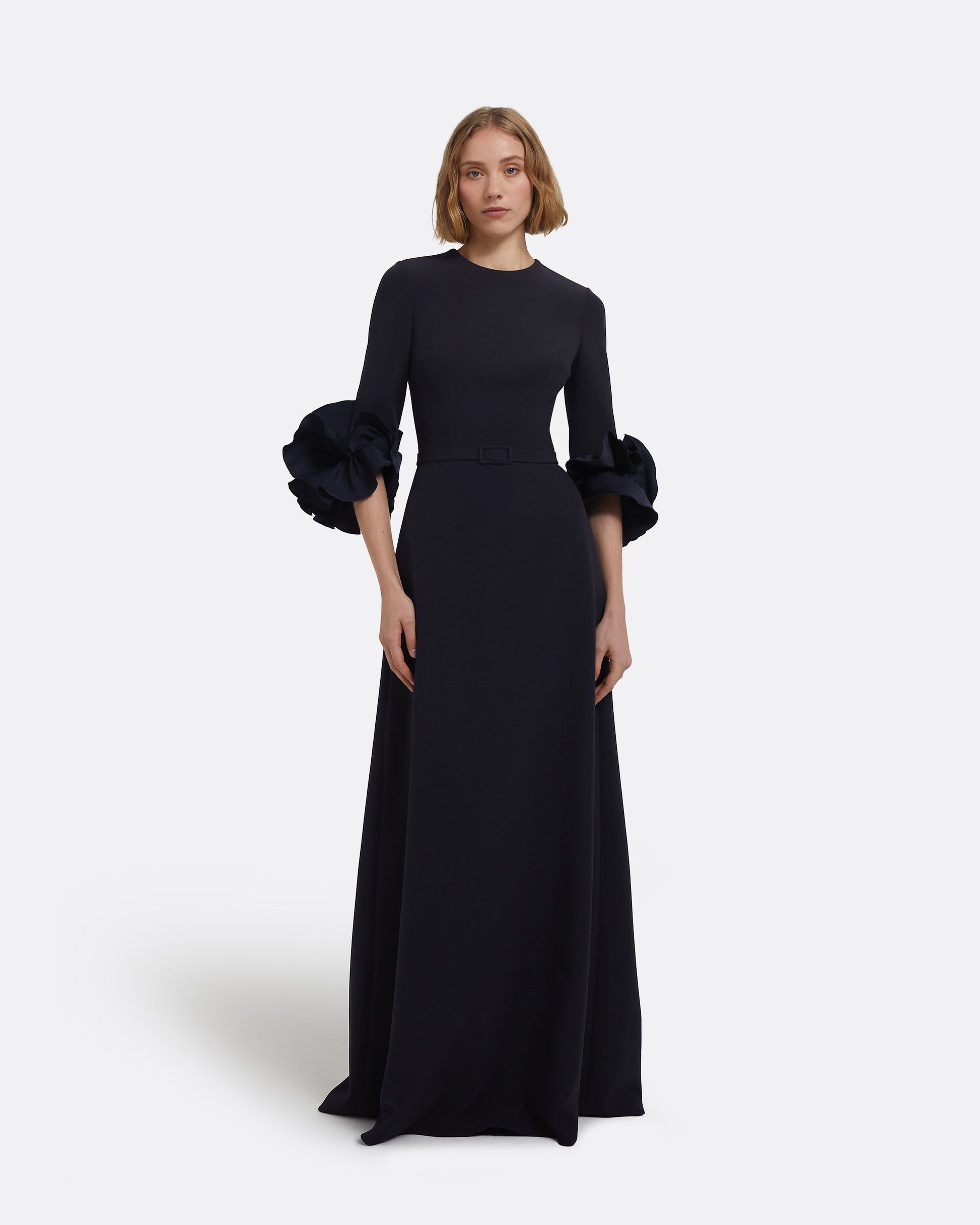 From the Pre-Fall '25 collection, the Belen dress in midnight navy is a study in refined contrast. Its flowing silhouette is complemented by sculptural accents, offering a commanding yet graceful presence.