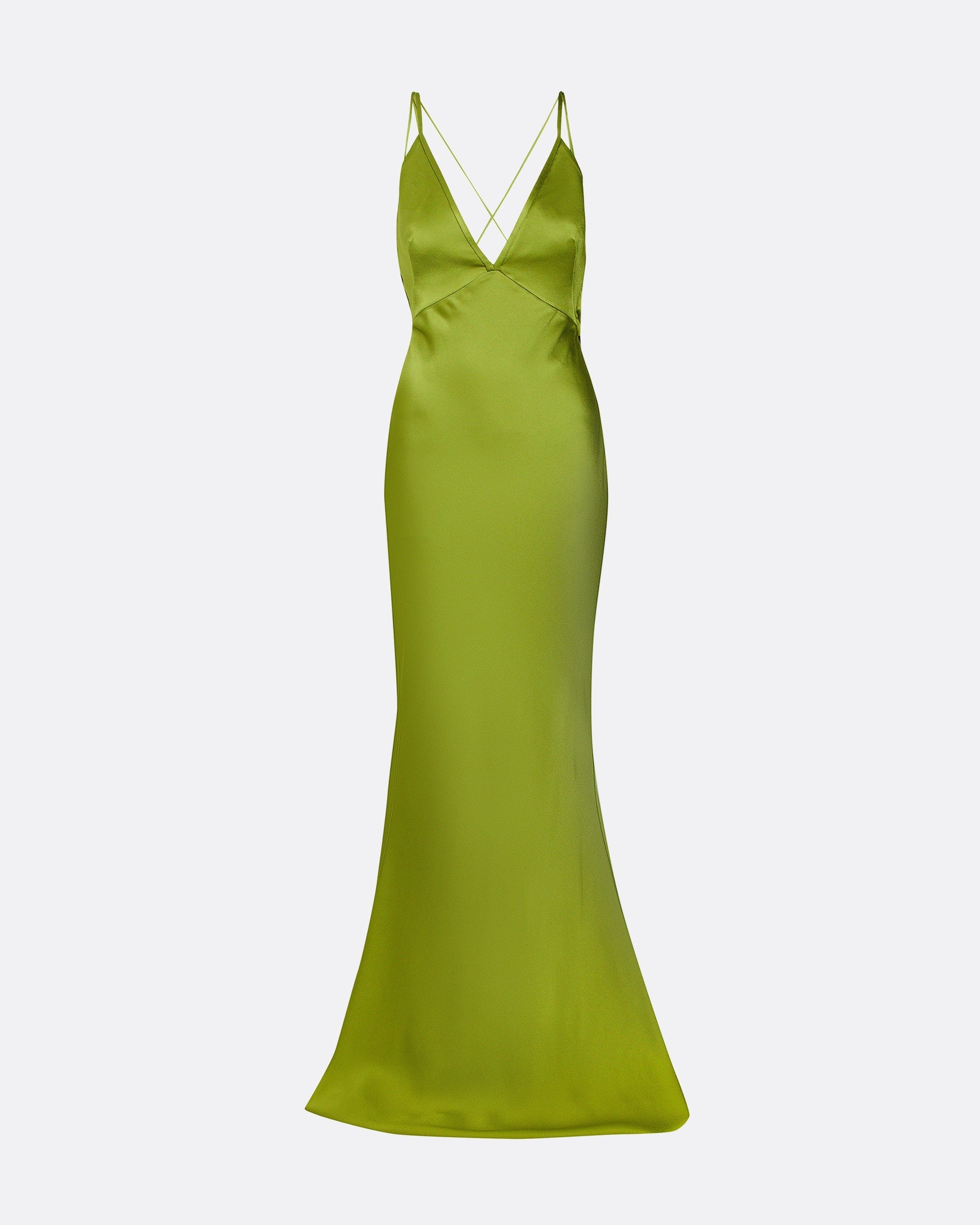 Fluid slip gown with sash drape detail in woodbine Satin back Crepe.