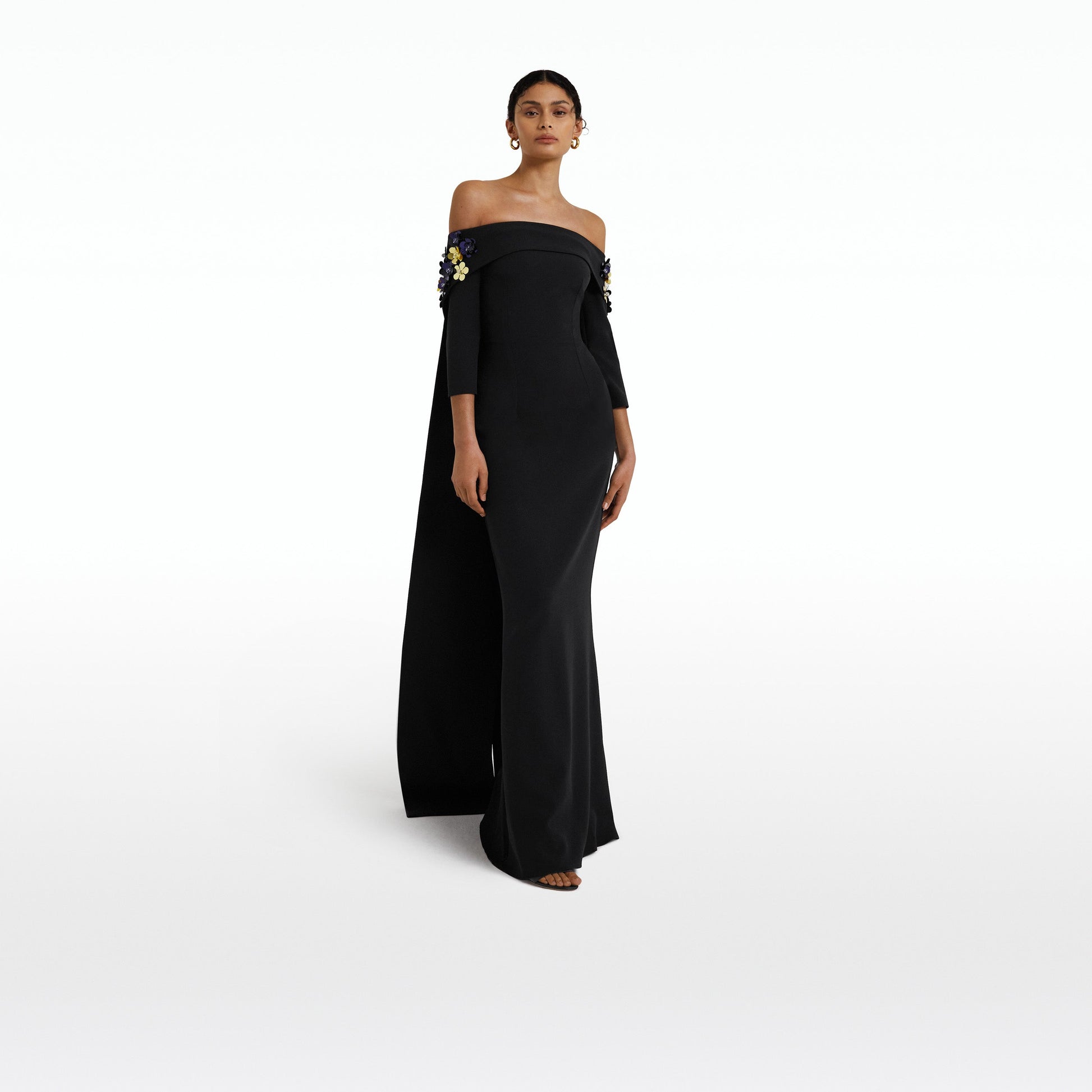 Bustier long dress and off shoulder topper with trail long back and straight sleeve, in black and gold & navy flora embroidery.