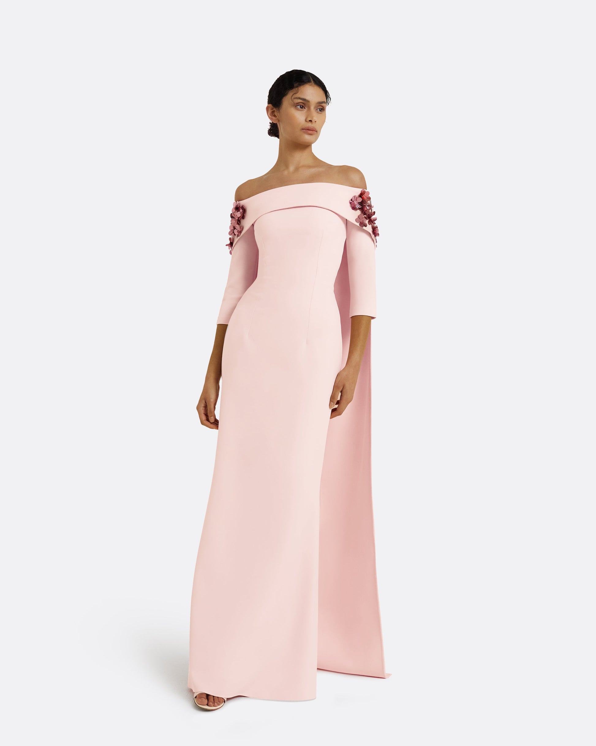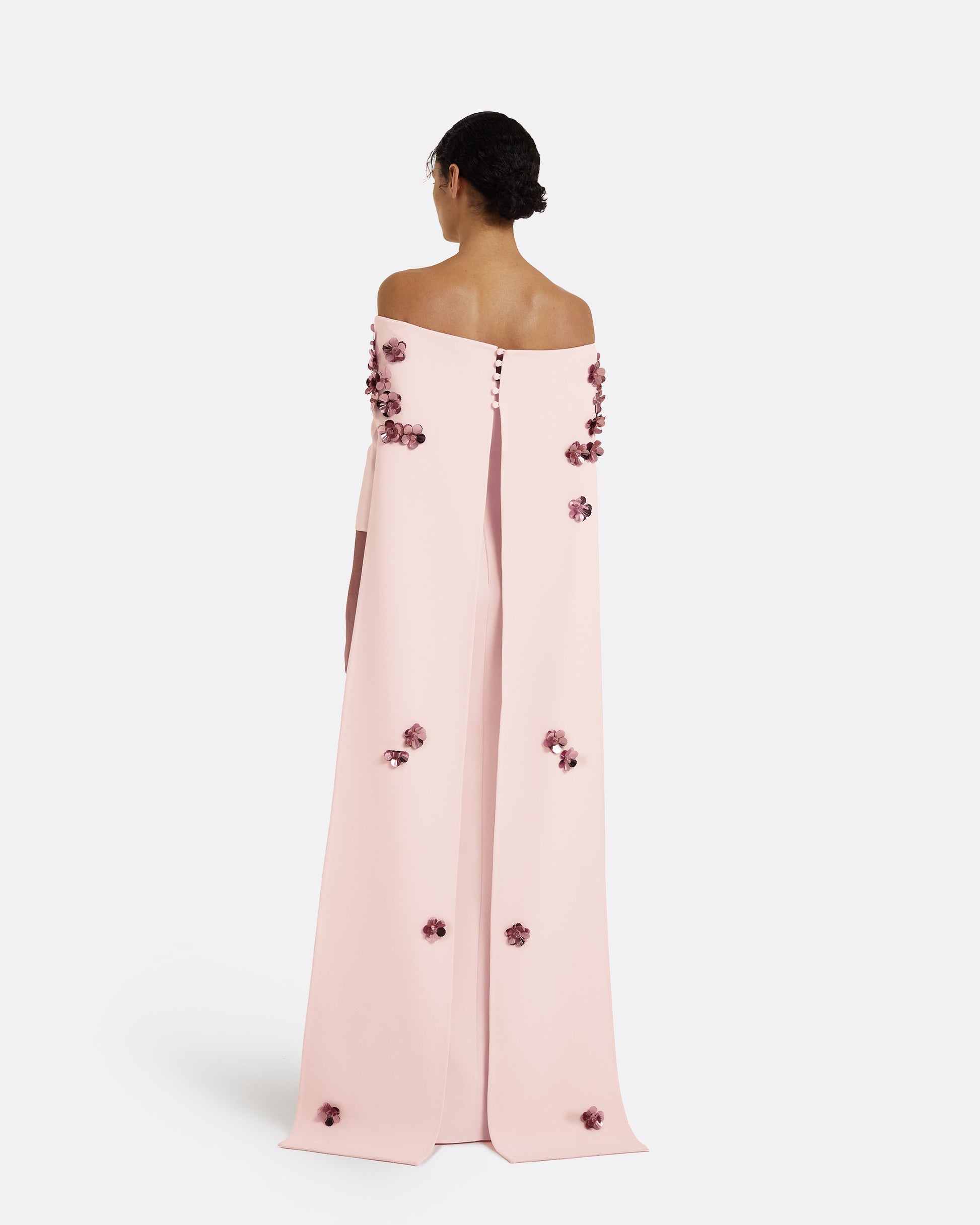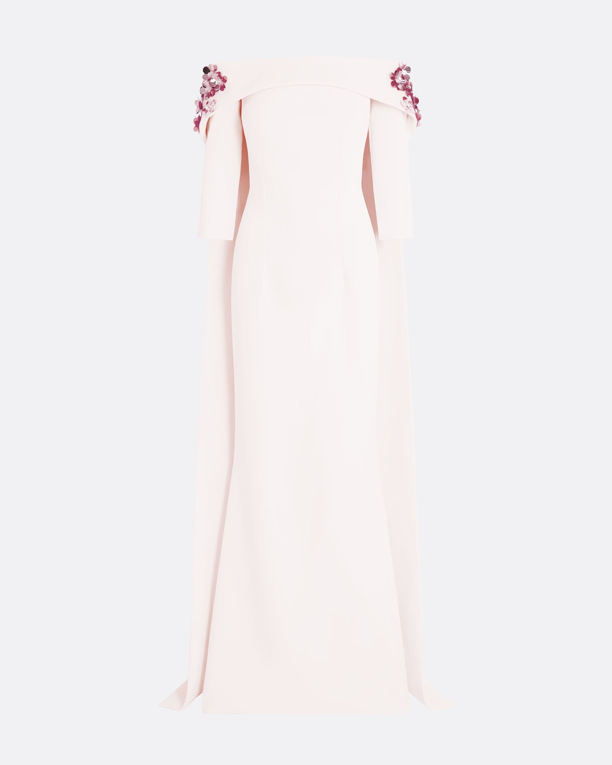Off-the-shoulder harness in pale pink, adorned with metallic Pink Flora embroidery, with a long trailed back with a deep split. Combined with full-length fitted strapless dress in pale pink.