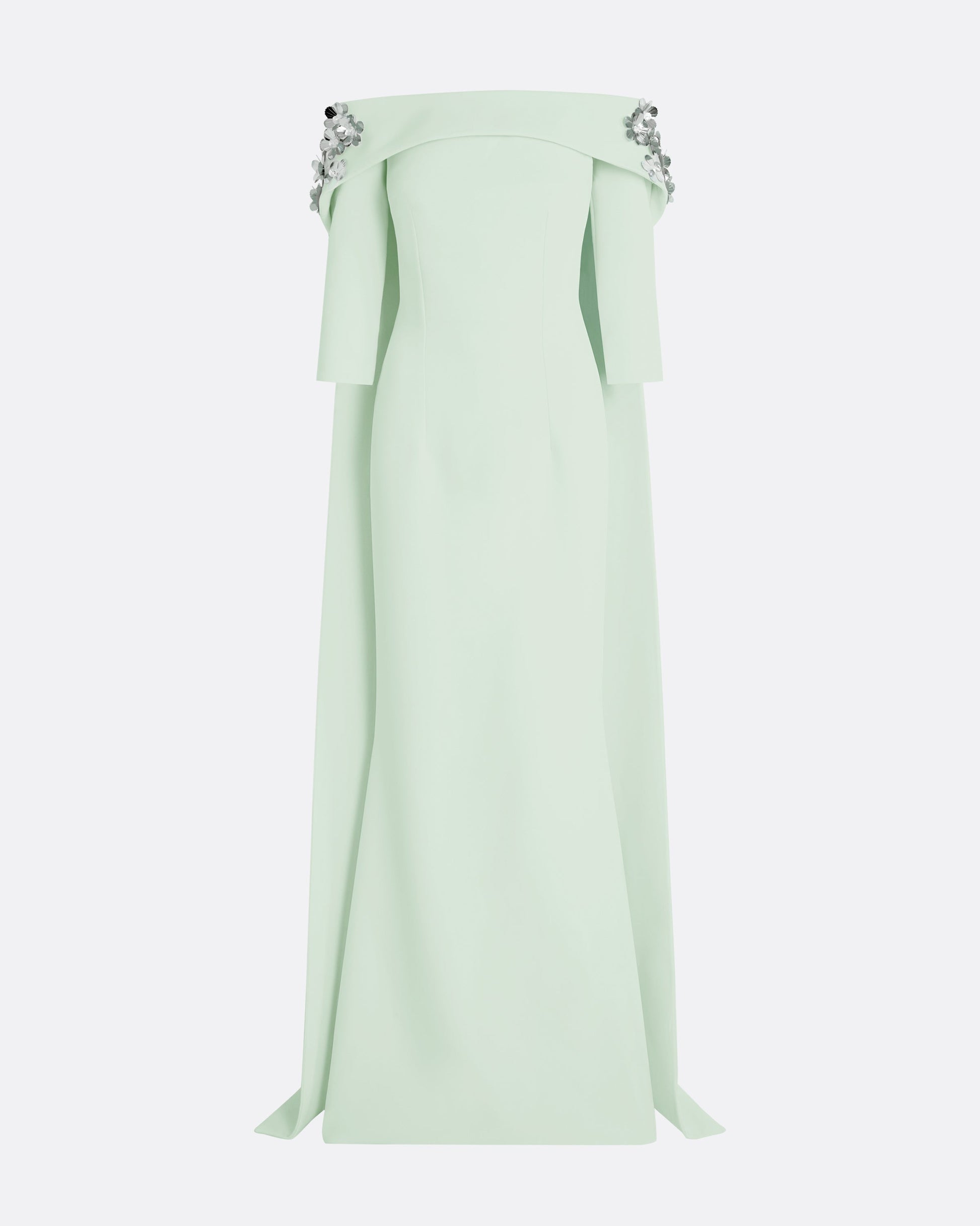 Bustier long dress and off shoulder topper with trail long back and straight sleeve, in spearmint and silver flora embroidery.