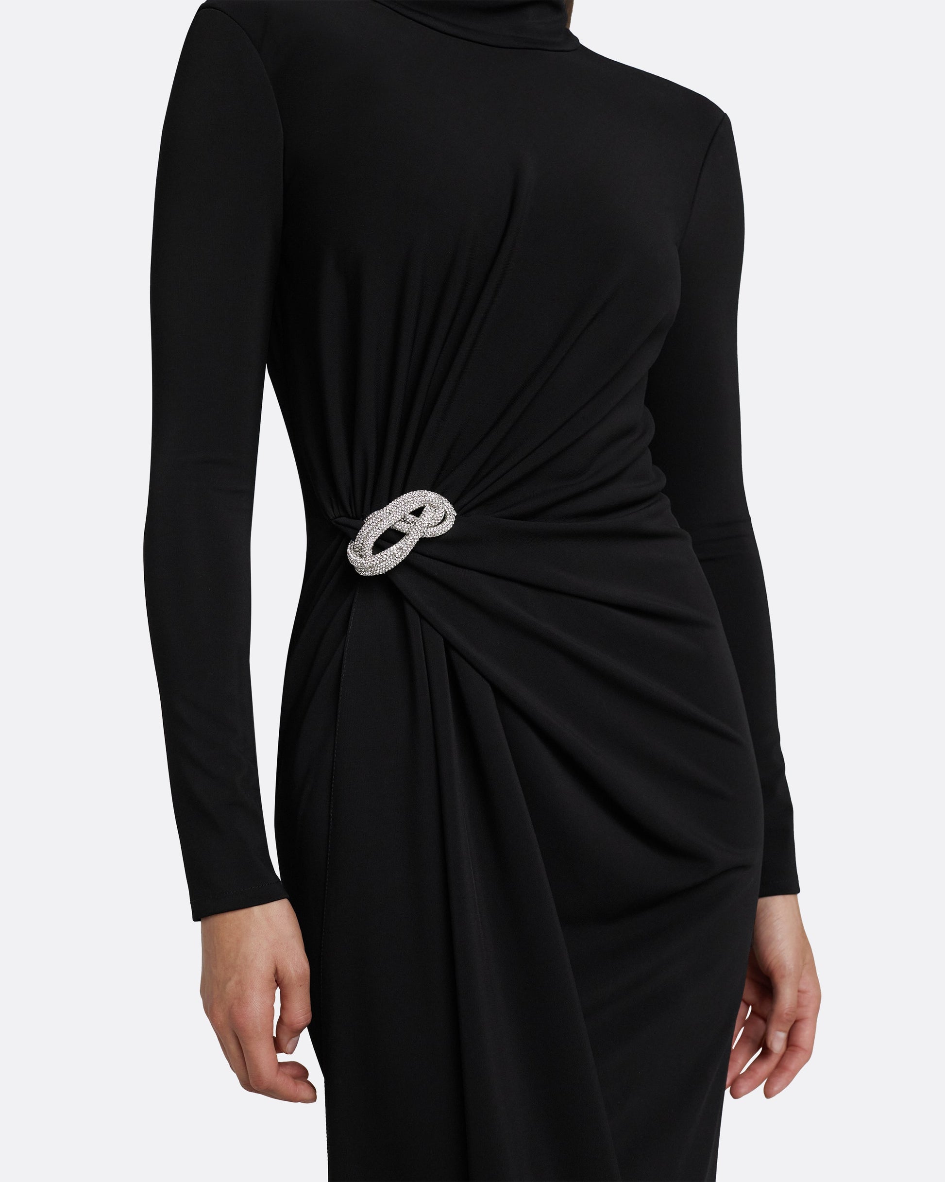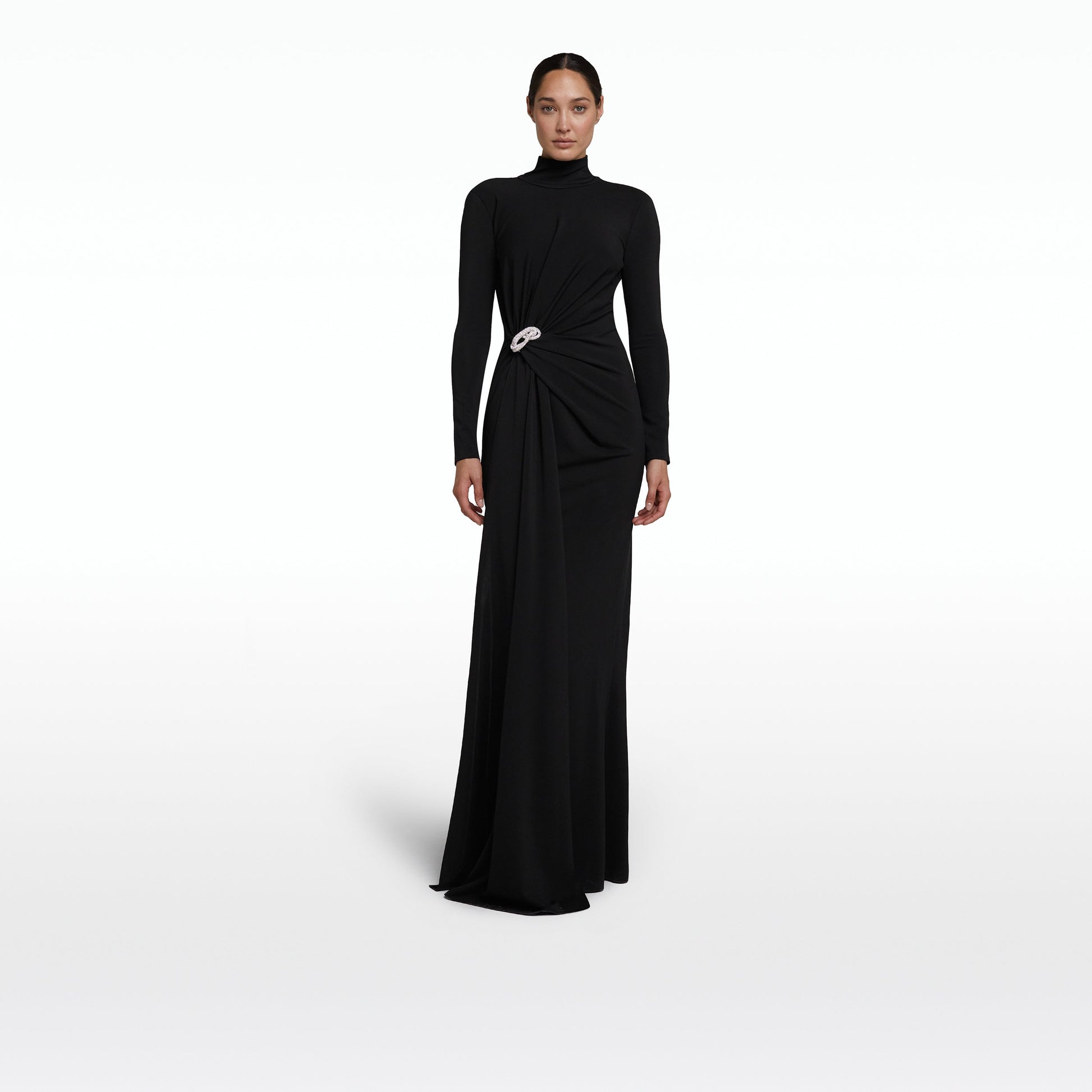 High neck gown, backless gown with intricate front knot drape in black Ava Jersey and Crystal Cord embroidery.