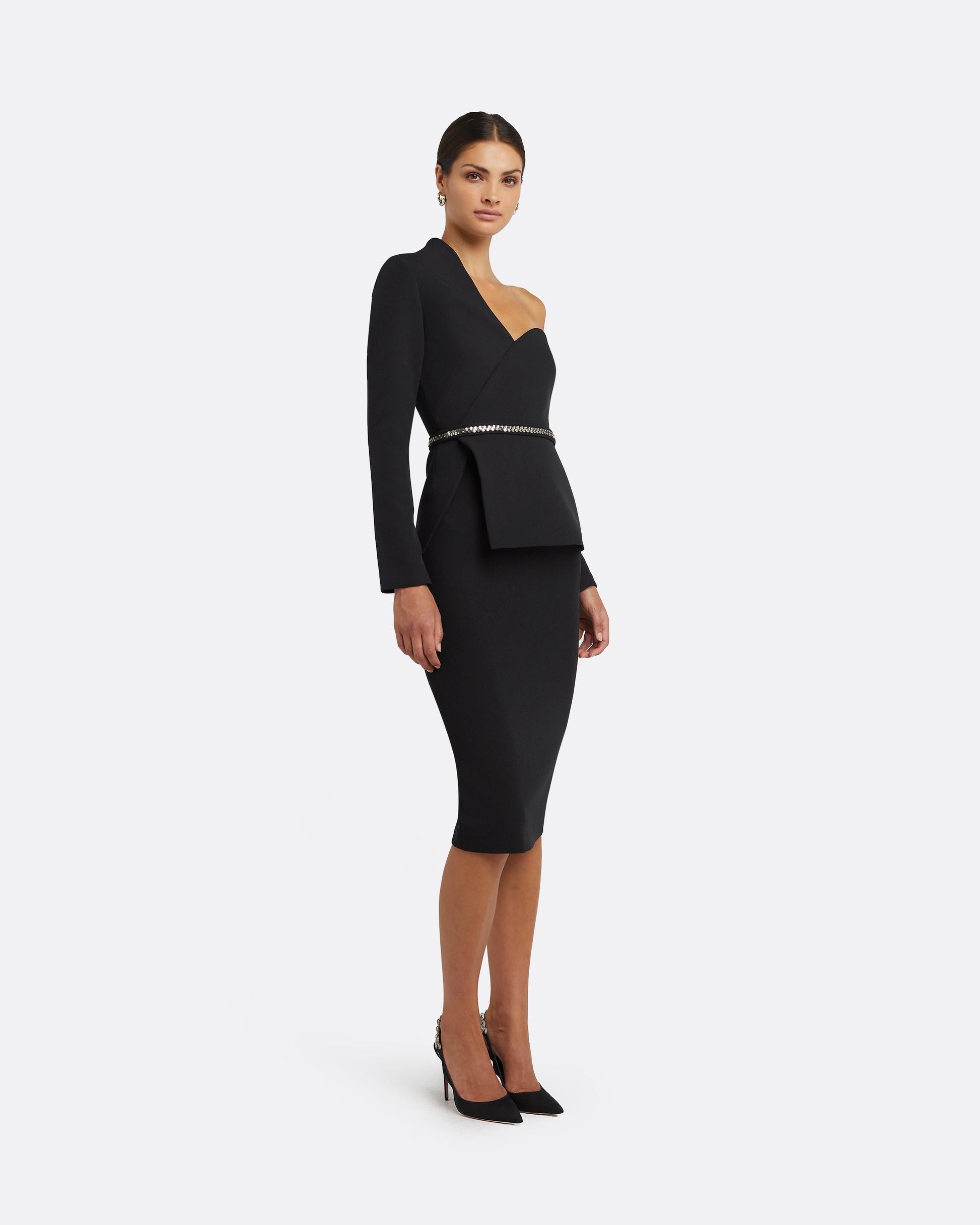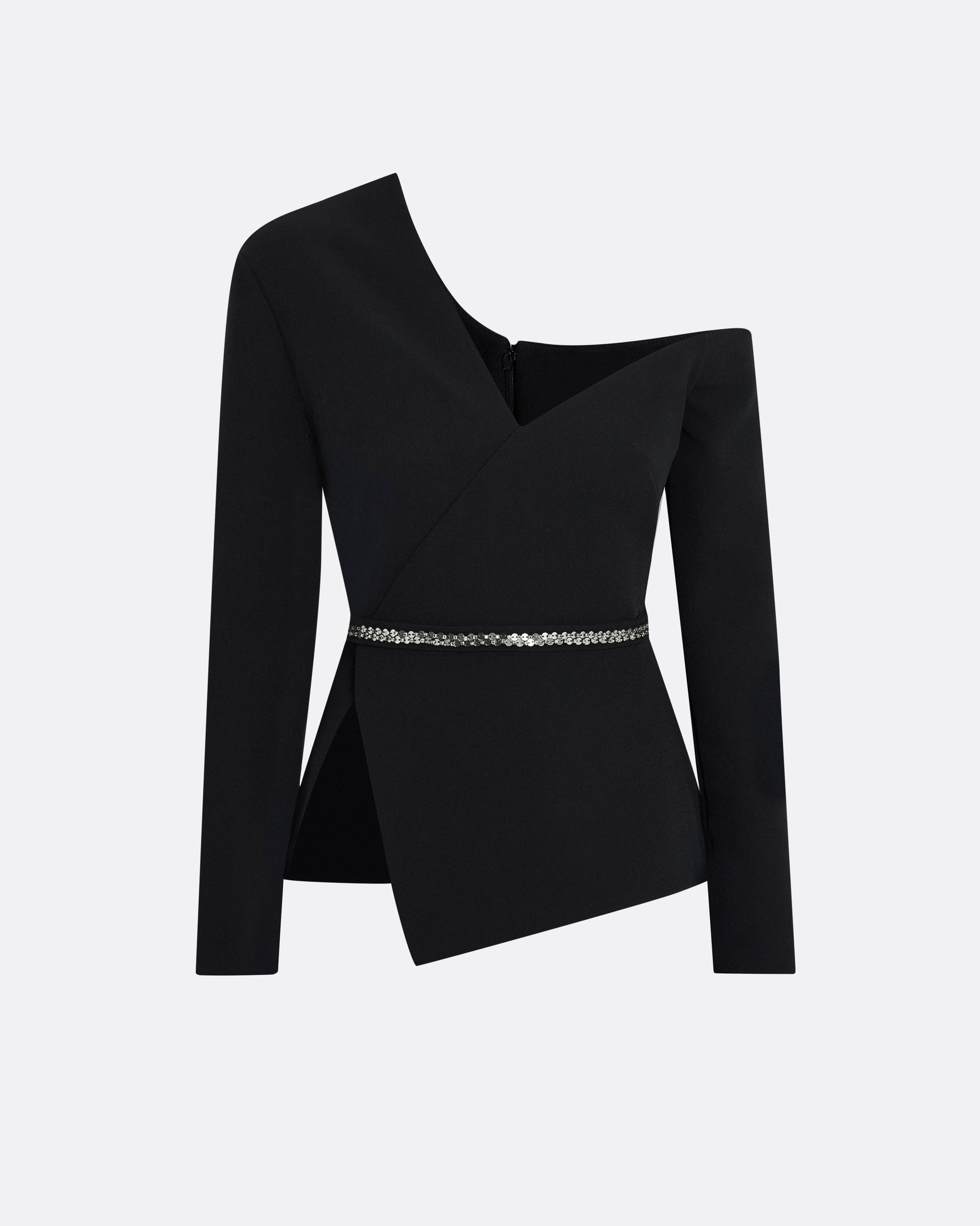 Asymmetric, long-sleeve top with split peplum and flattering neckline in black Heavy Crepe with gunmetal Mirror Disc embroidery.