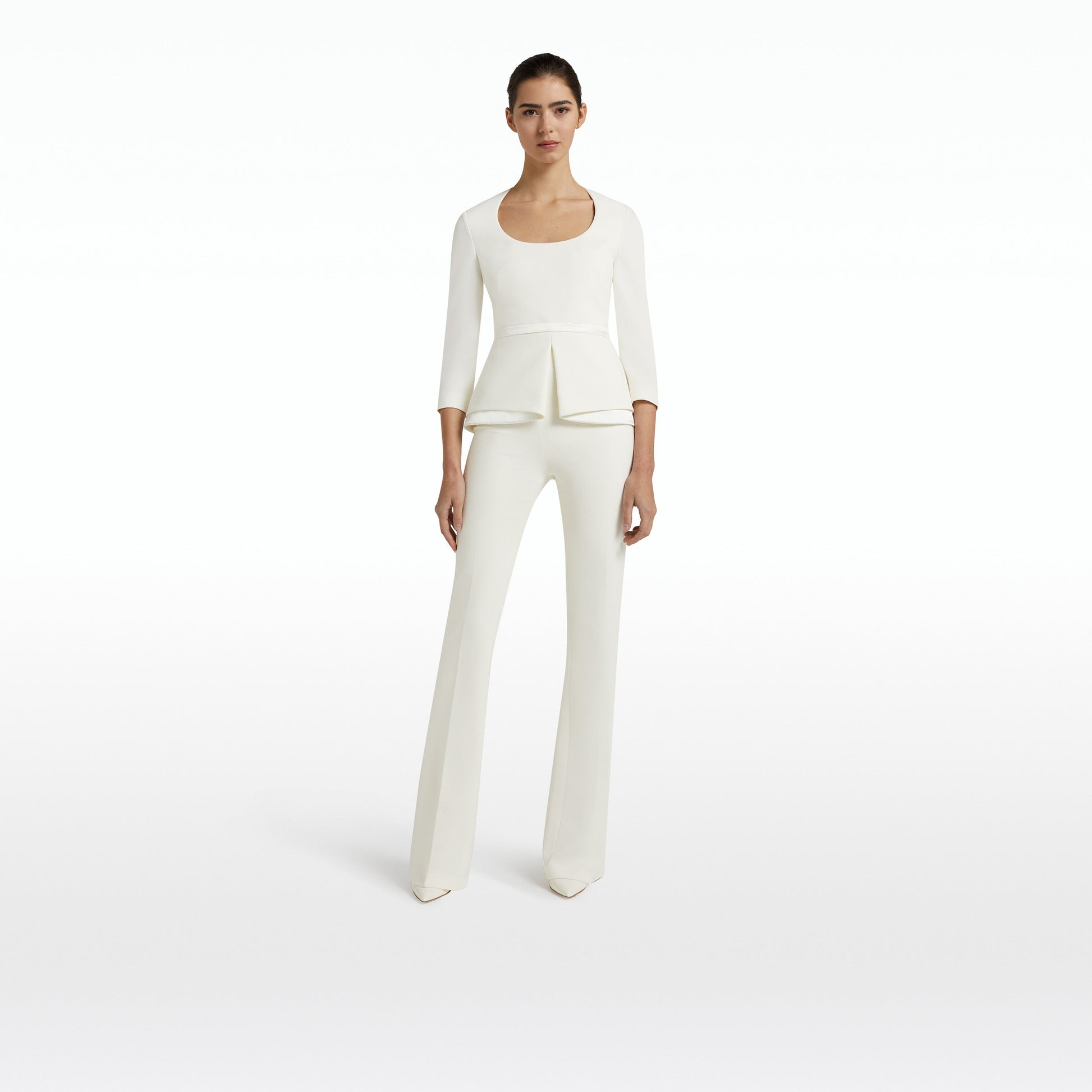 Foldover peplum top with sleeves and scooped round neck in ivory Heavy Crepe and Shine Satin.