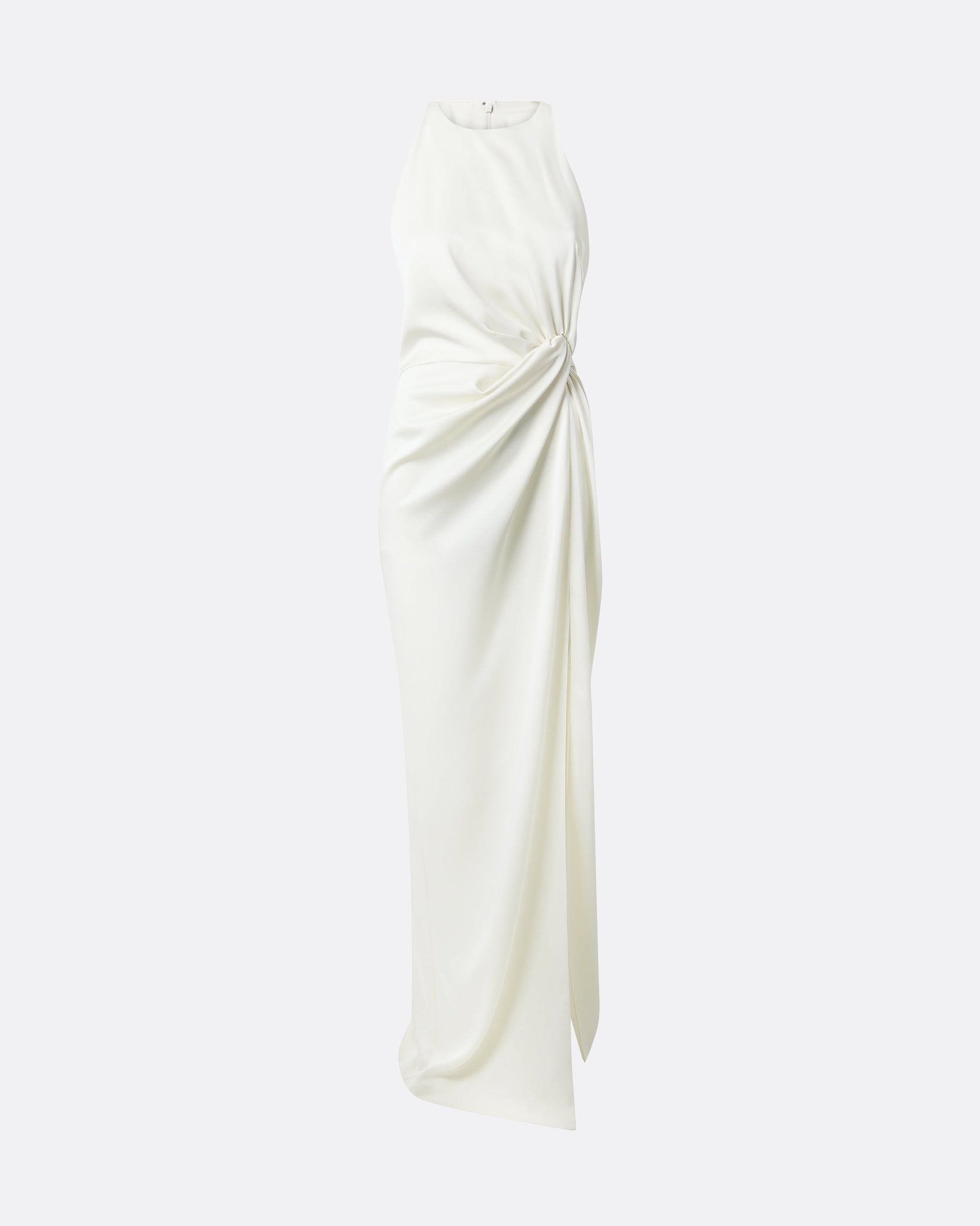Racer neck long dress with draped, slit detail skirt in ivory Satin Back Crepe.