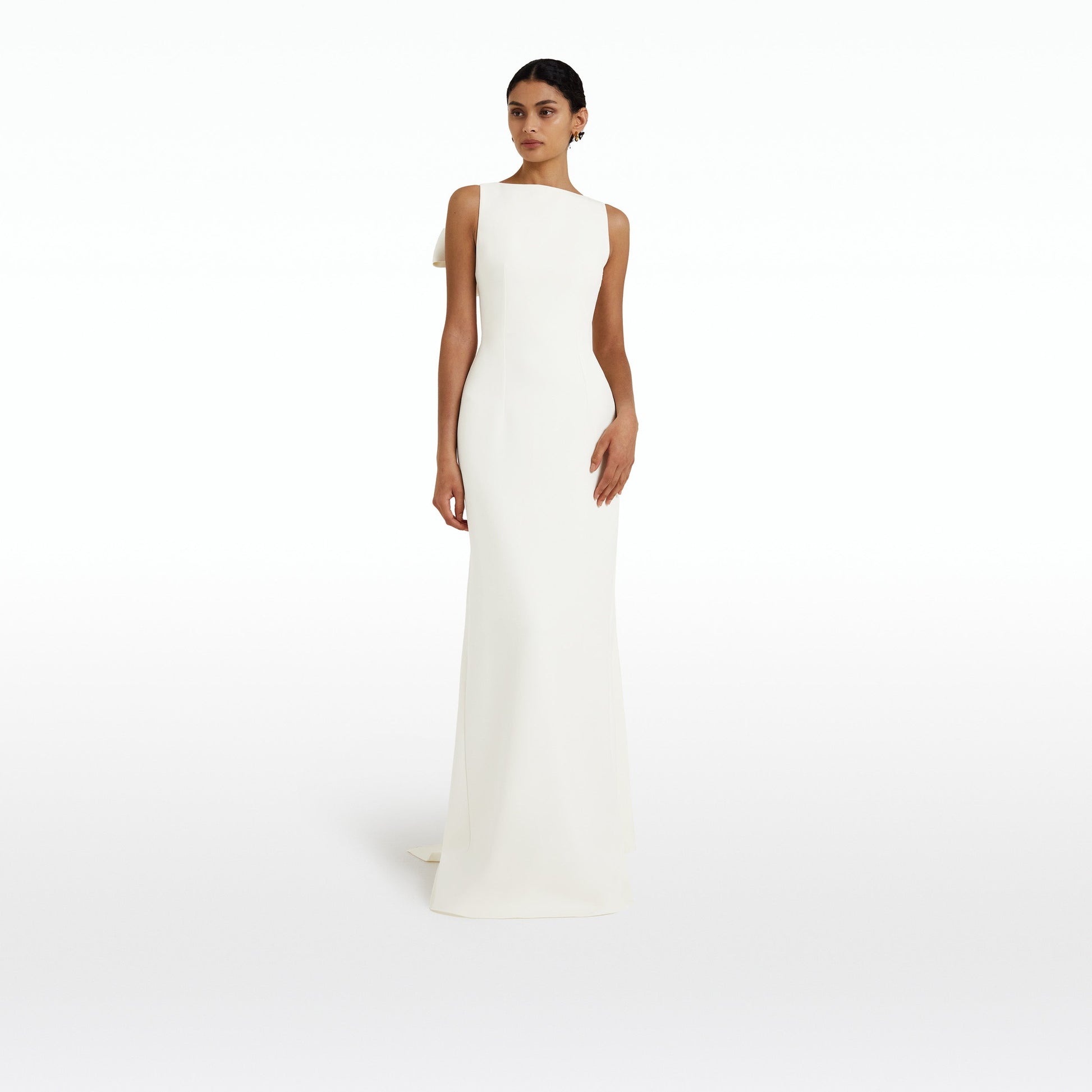 Full-length dress in ivory heavy crepe with a boat neckline, folded drape at the reverse and long tail strap. Item fully lined.