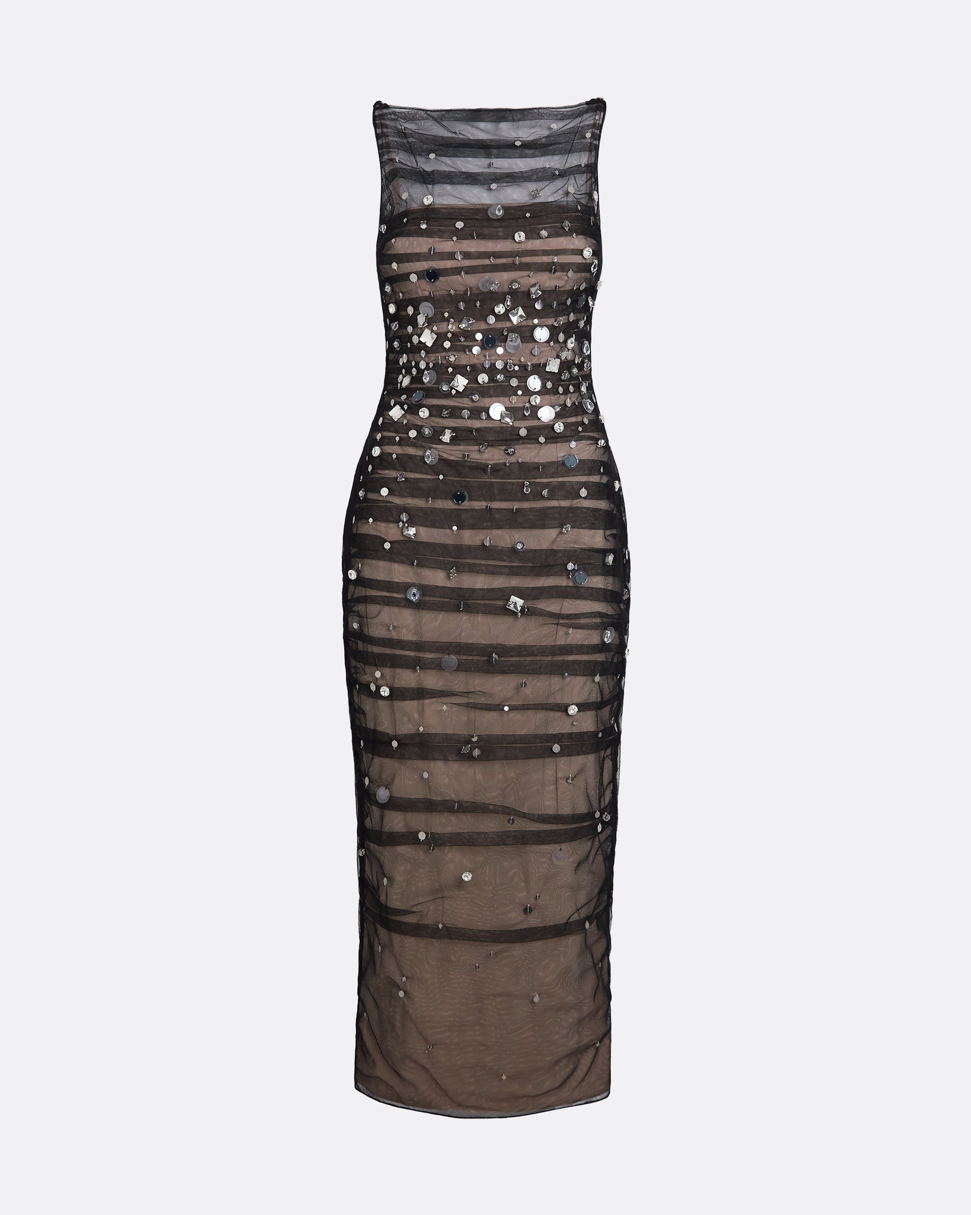 Mid-calf, layered dress with pleat details in black Light Tulle with crystal Elisabetta embroidery.
