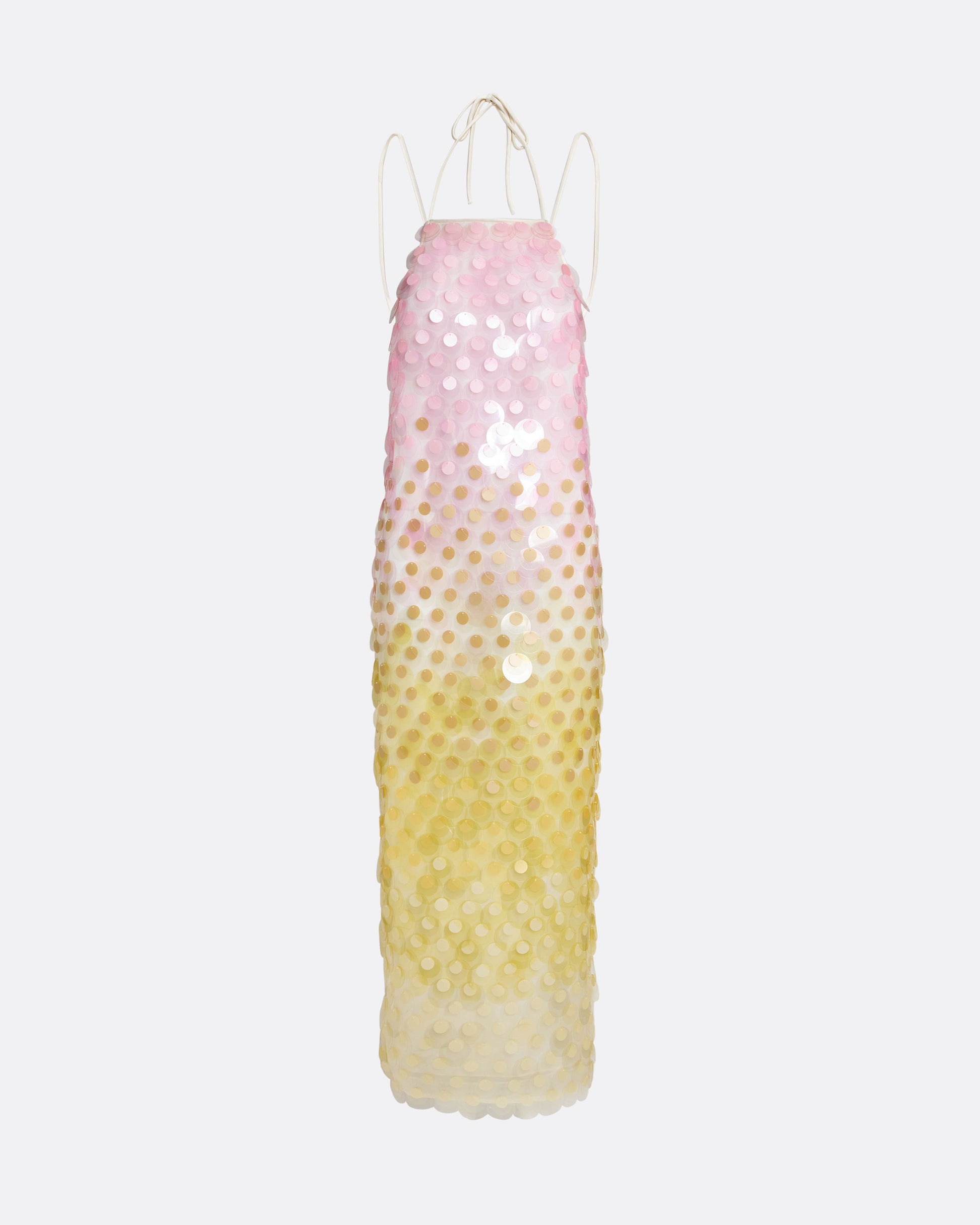 Statement halter cocktail dress with open back in multi-pastels Maggie Sequin.