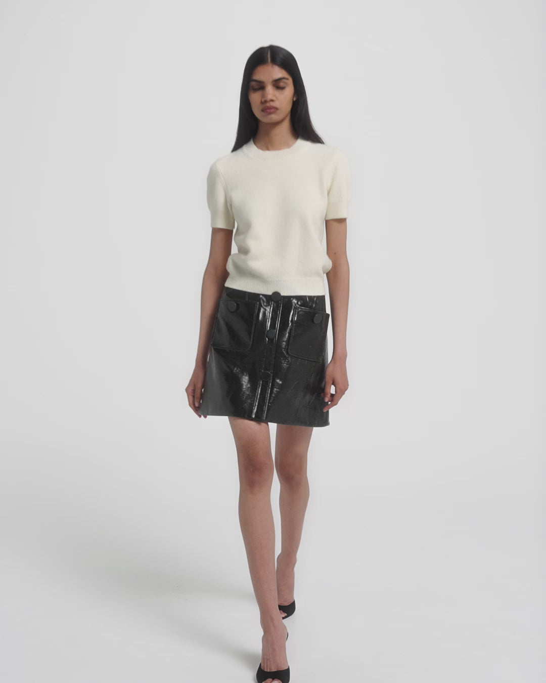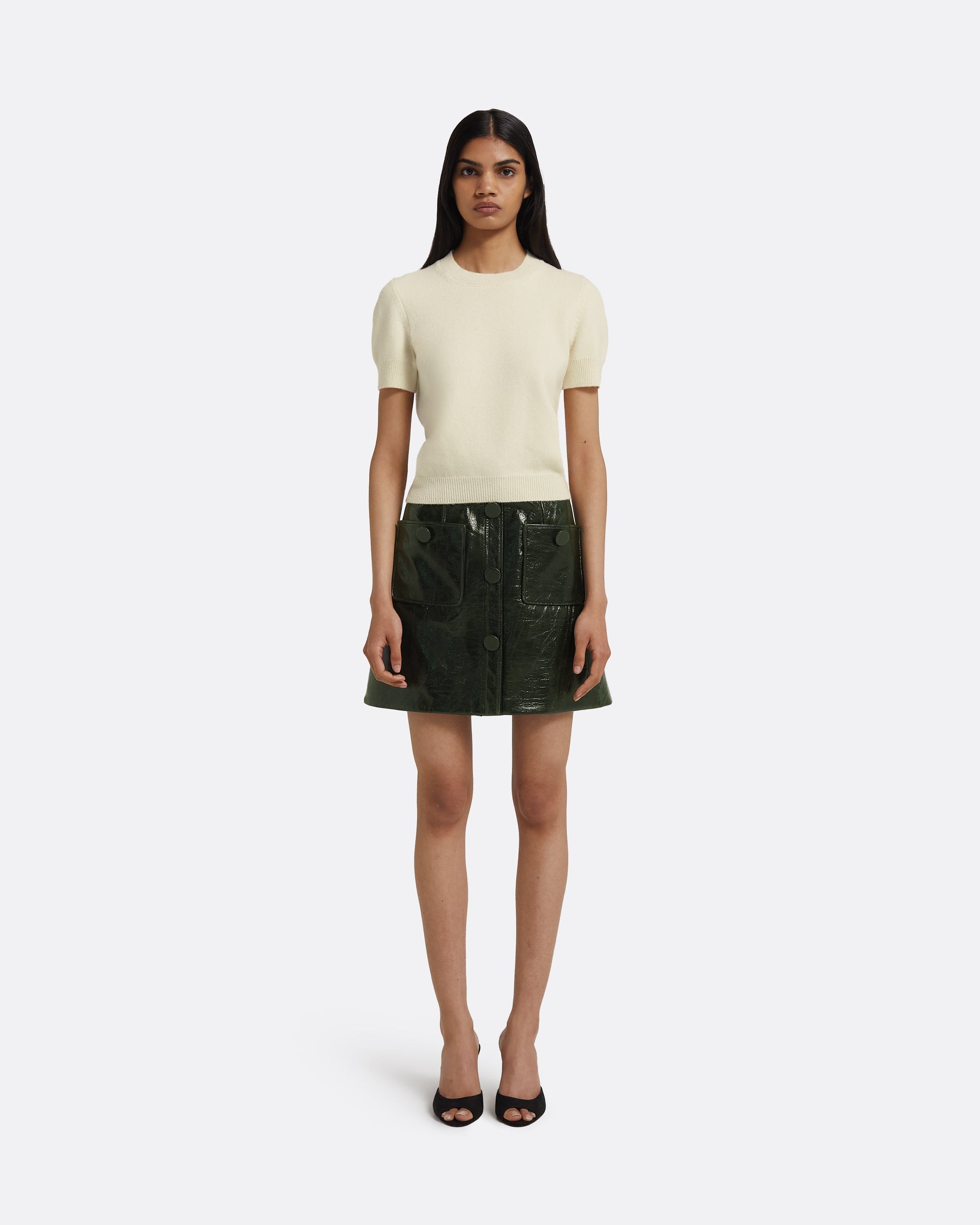 From the Resort ’26 collection, the Dallas skirt in collard green reflects rebellious energy through its high-gloss surface. The compact cut contrasts shine with structure, giving the piece a modern edge.