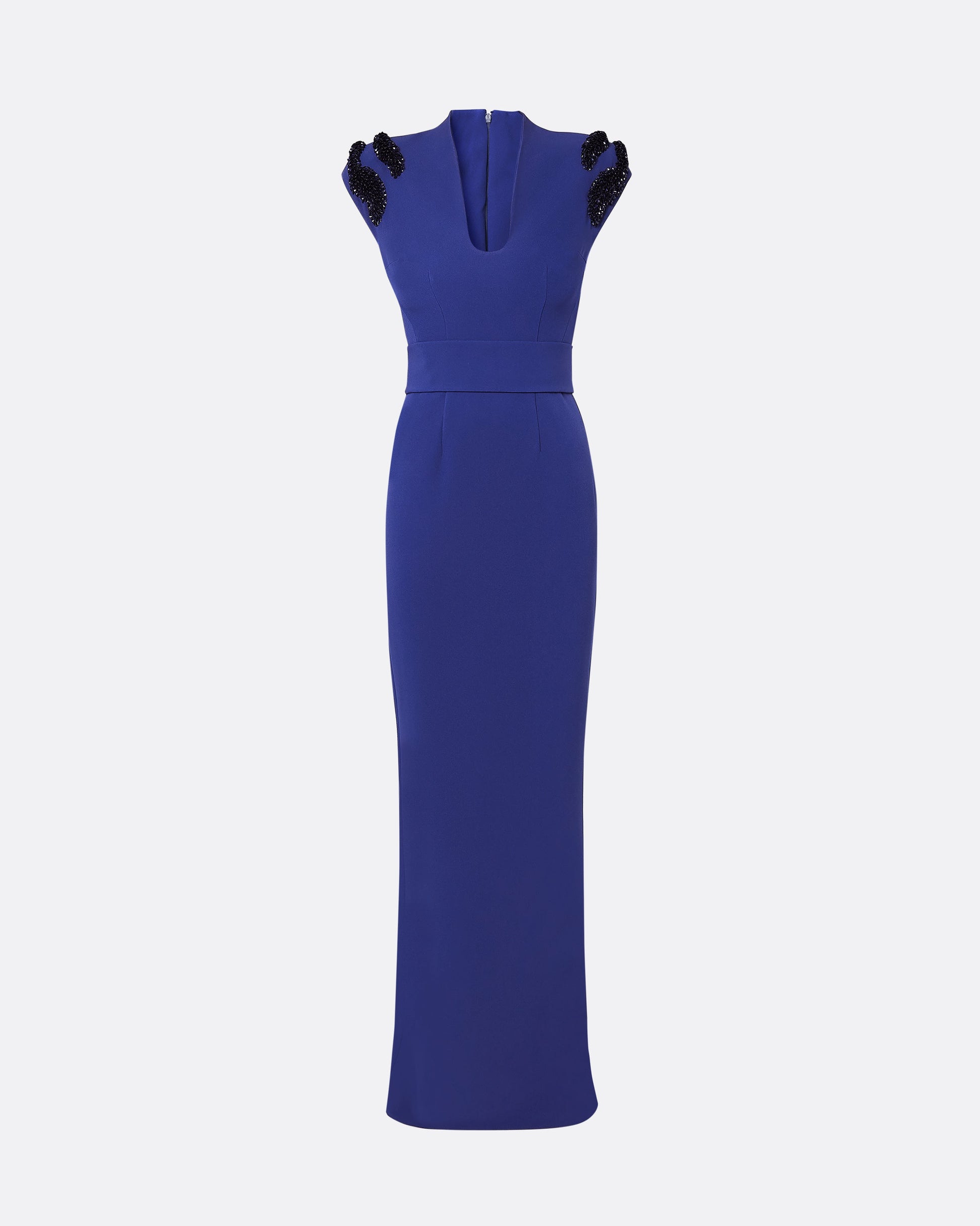 Cap sleeved long dress with deep curved neckline in skiathos blue Heavy Crepe with navy Curled Leaf embroidery.