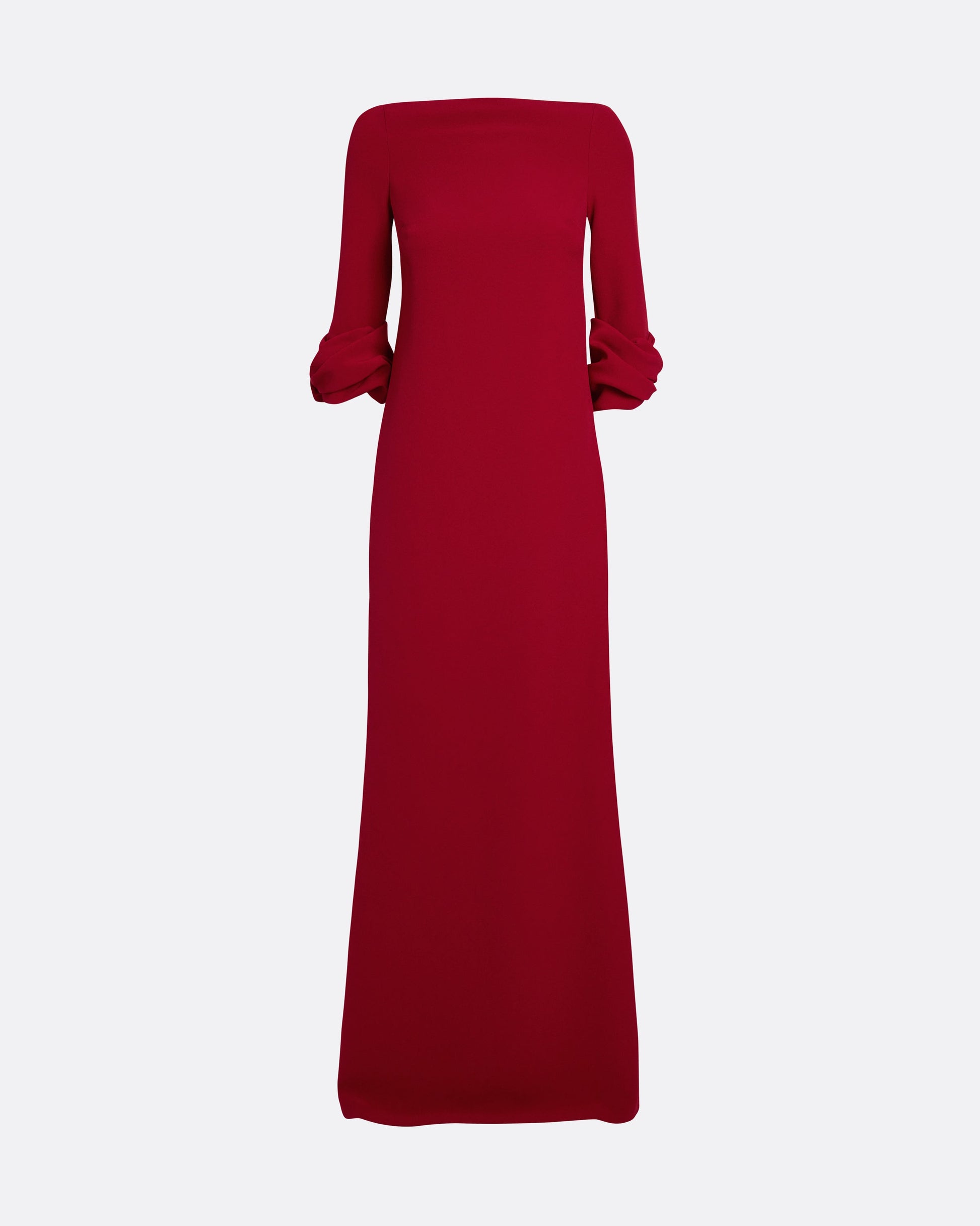 From the Spring Summer ’26 collection, the Danica Dress in azalea red offers a sculptural approach to occasionwear. Its wide bateau neckline and gathered cuffs create a poised, architectural line that extends to the floor.