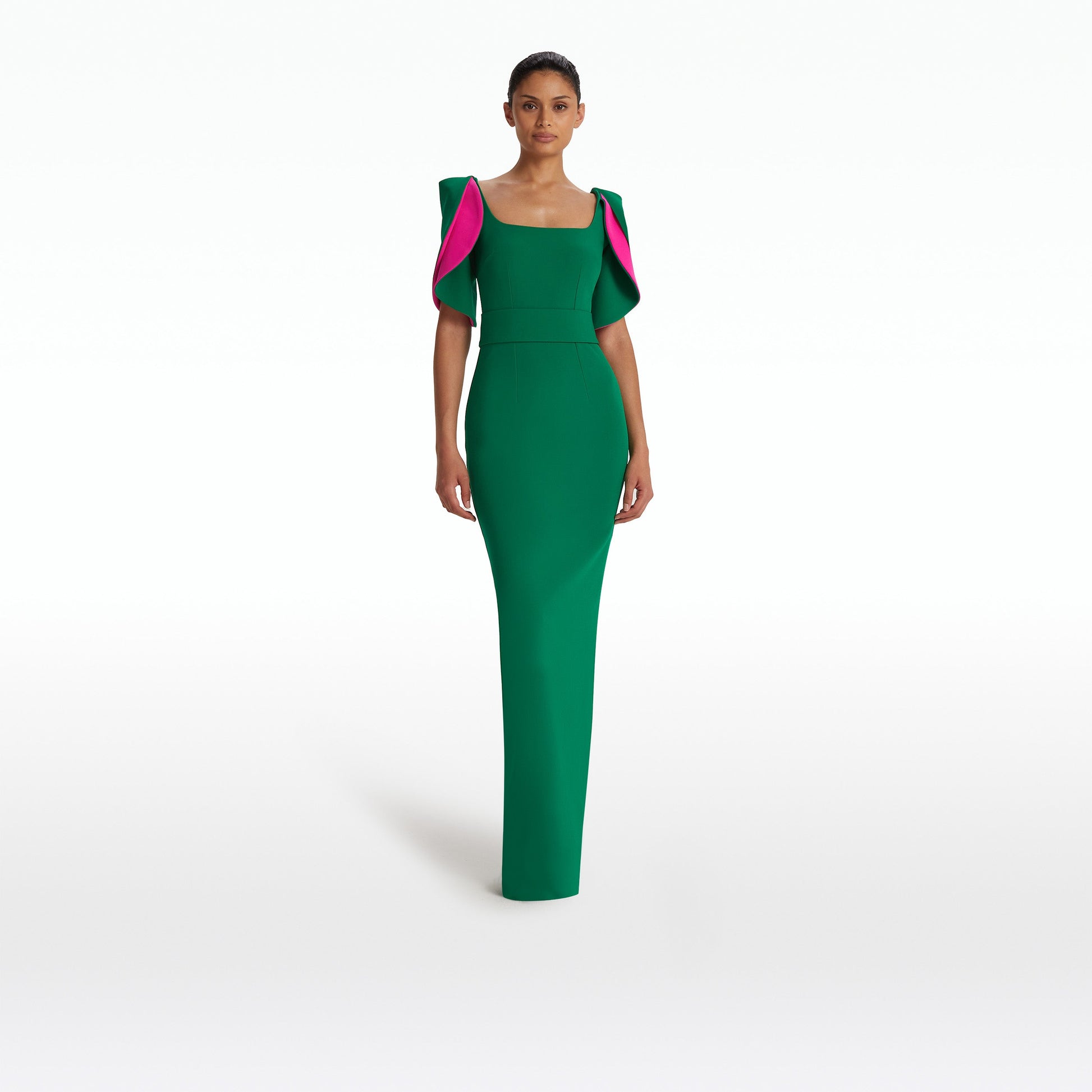 Square neck long dress with lotus sleeve drape in wild strawberry on jewel green Heavy Crepe.