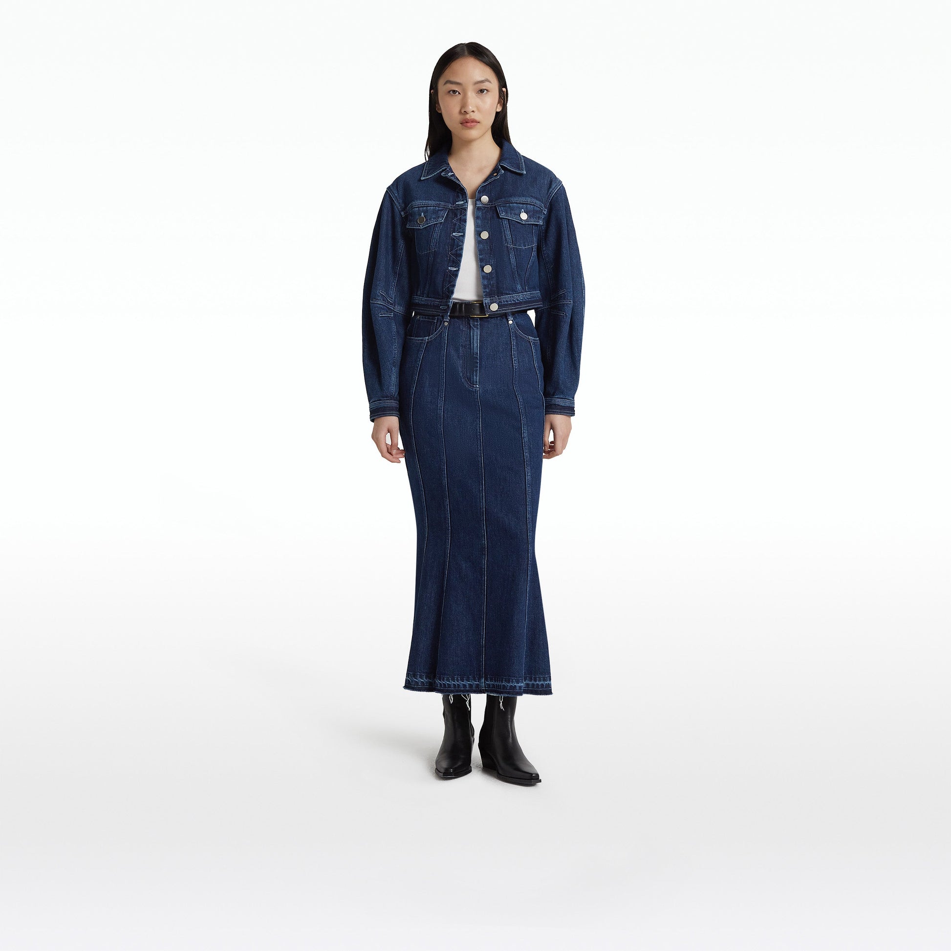 Long skirt with seam detailing in mid wash Indigo Denim.