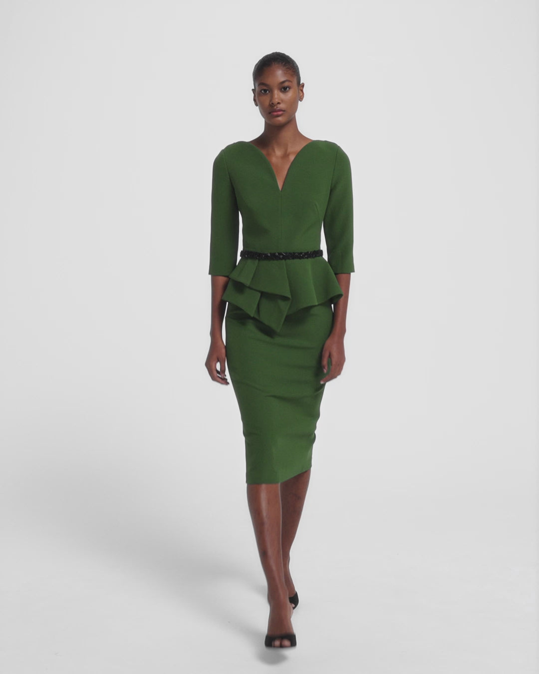 From the Resort ’26 collection, the Dion top in moss green embraces sculpted energy with a sharp neckline and defined waist. Paired with the Jonia belt in black, the look is anchored with contrast, amplifying its bold presence.