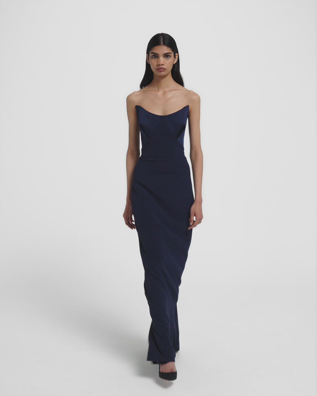 From the Resort ’26 collection, the Drew gown in maritime blue emphasises strength through clarity of line. A corset bodice defines the frame, giving structure to the elongated column cut.