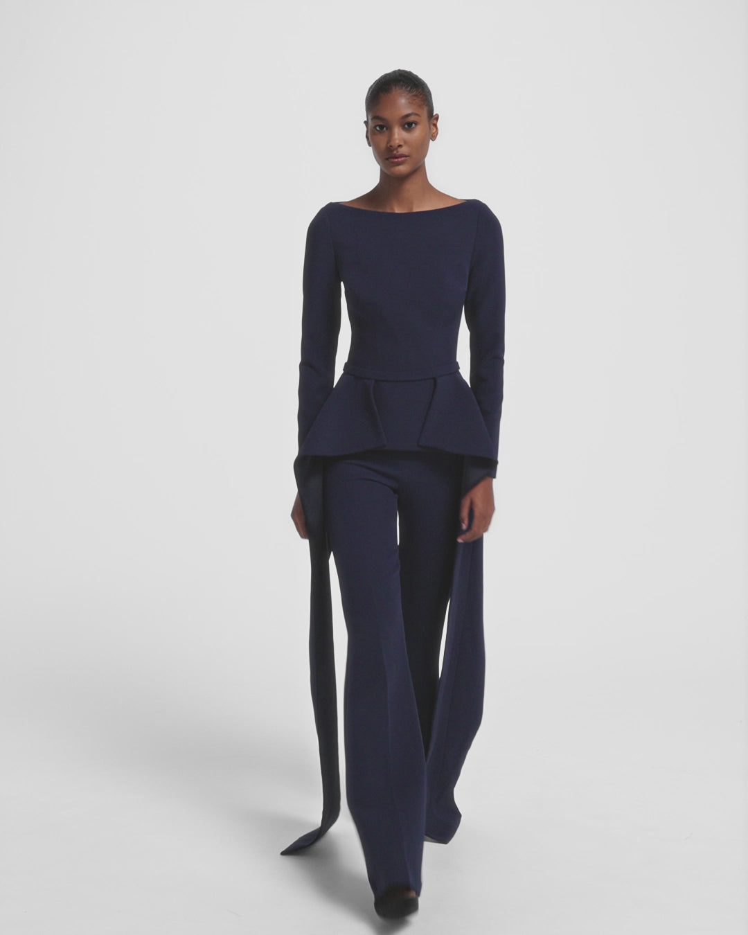 From the Resort ’26 collection, the Dylan top in midnight navy on maritime pairs structural poise with sculptural design. Defined by its flared peplum and sweeping side tails, the silhouette is anchored by a clean boat neckline and long sleeves.