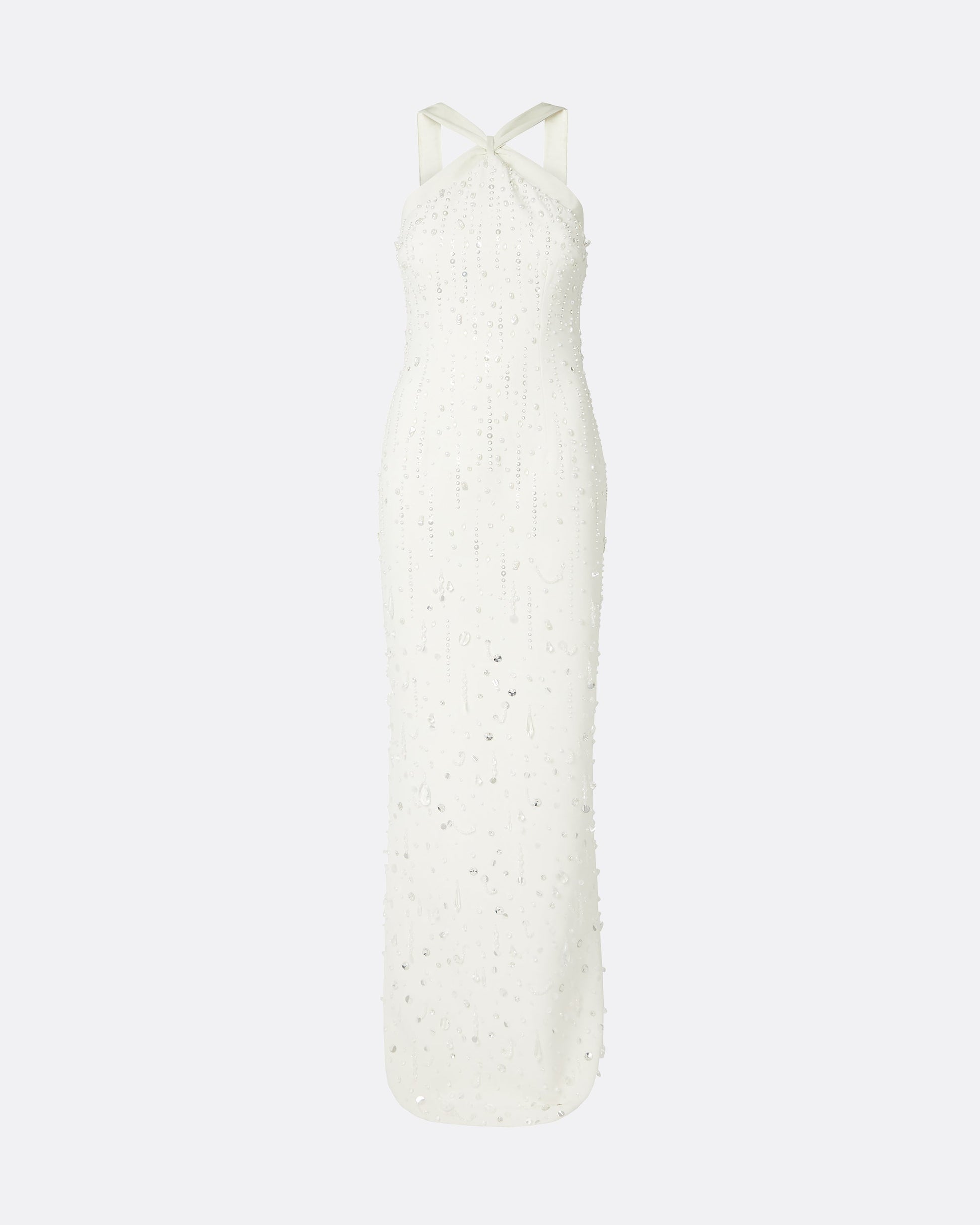 Floor length, halterneck gown with column skirt in ivory Heavy Crepe and crystal/pearl Cecil embroidery.