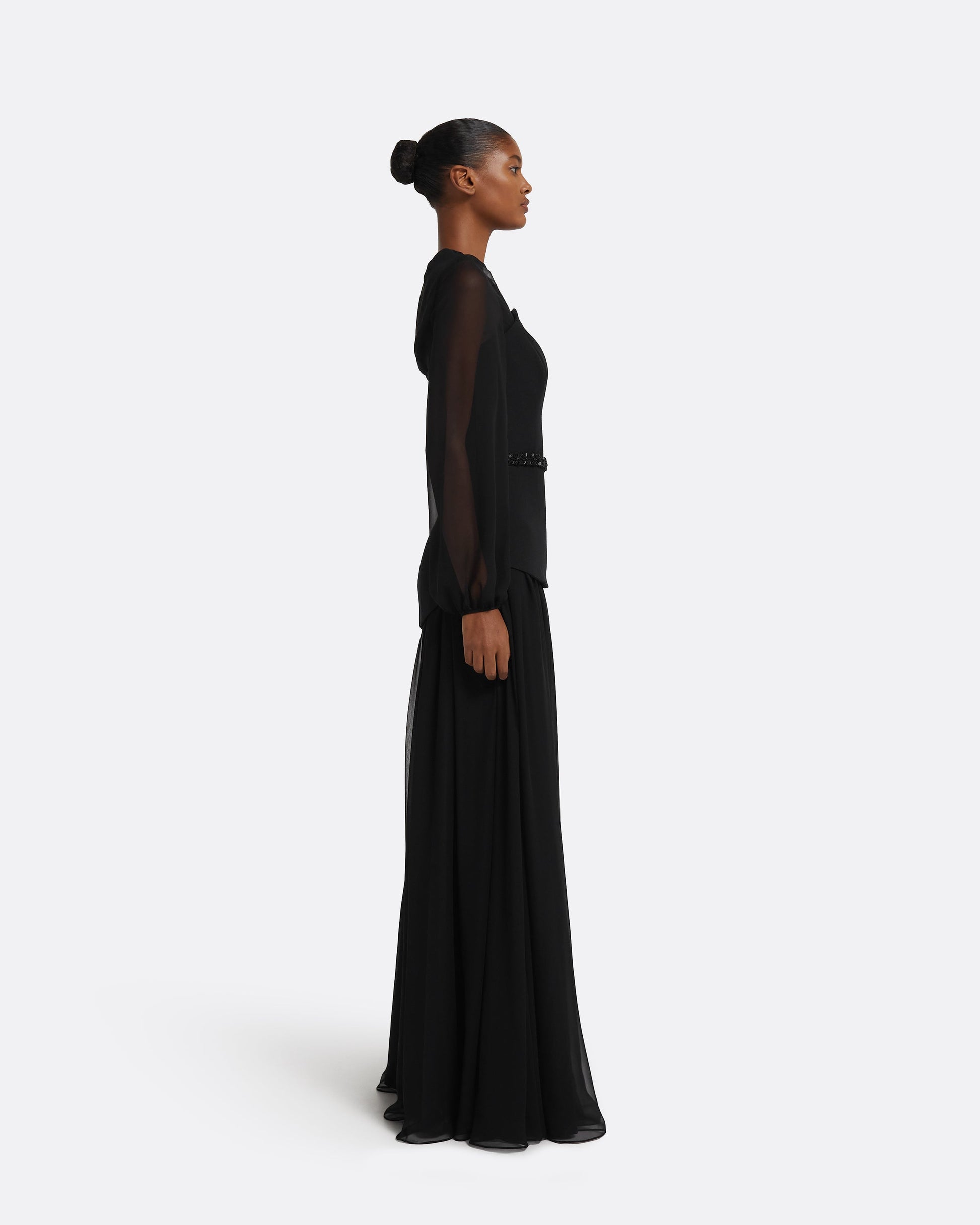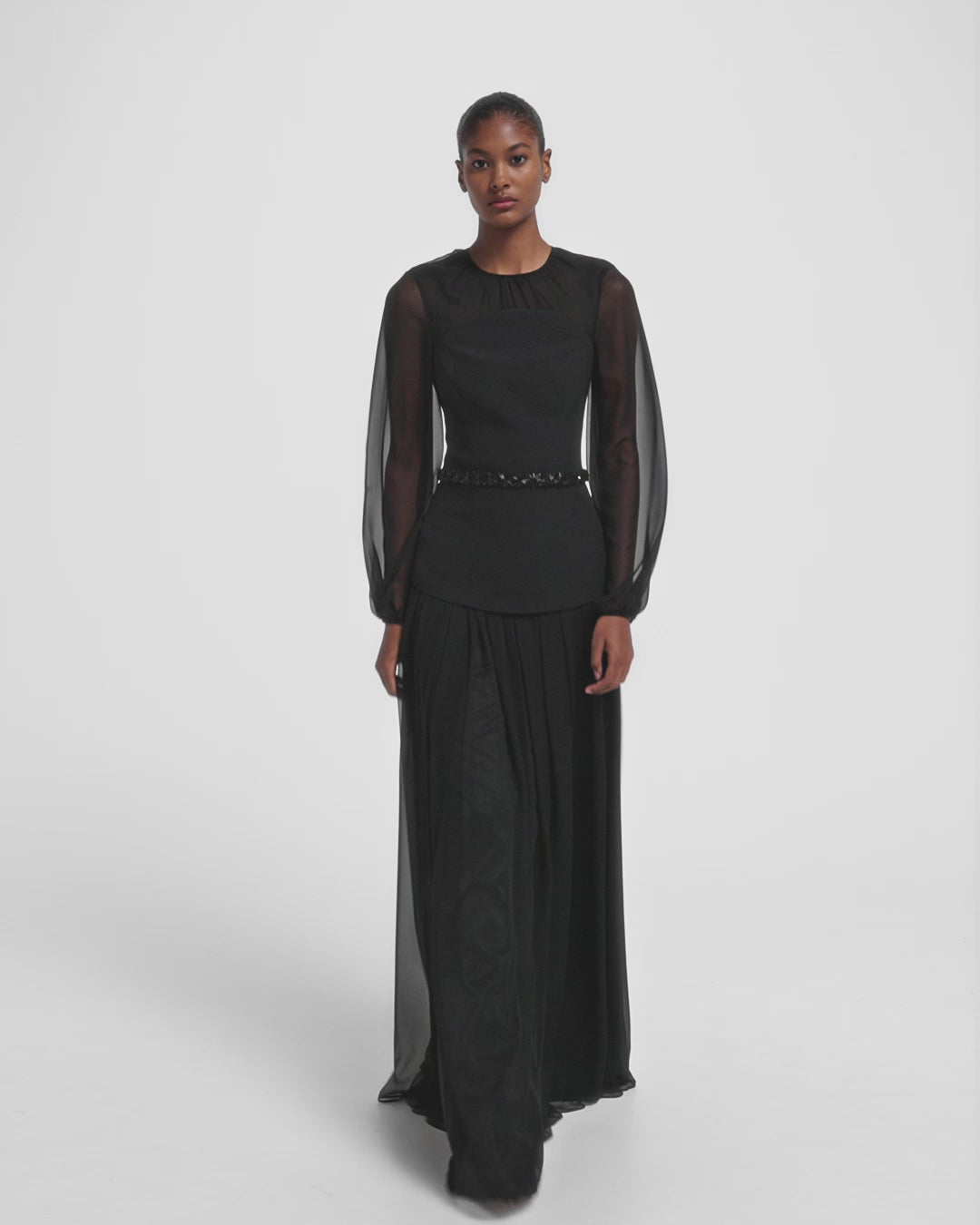 From the Resort ’26 collection, the Finley gown in black captures contrast through its interplay of softness and definition. Flowing lines meet sculpted structure, elevated with tonal embroidery at the waist.