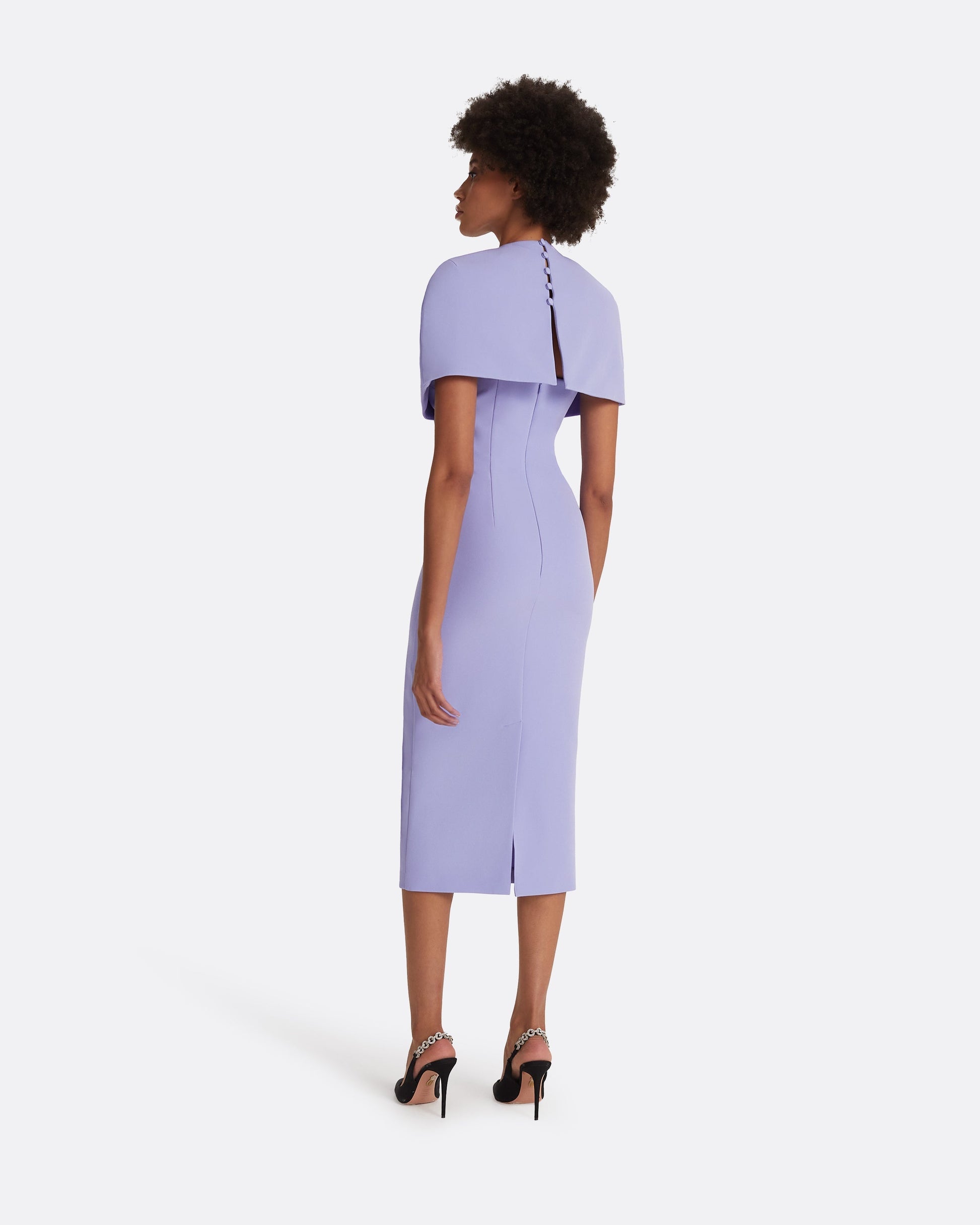V neck knee long dress with pleated wrap top in periwinkle Heavy Crepe.
