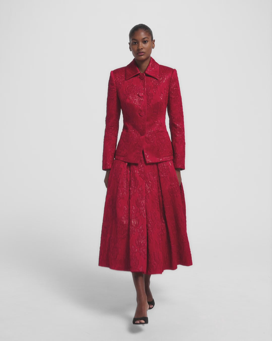 From the Resort ’26 collection, the Flynn jacket in crimson brings structure and texture into perfect accord. Crafted in sculpted floral jacquard, its sharp lines are softened by the depth of the tonal relief, catching the light with every movement.