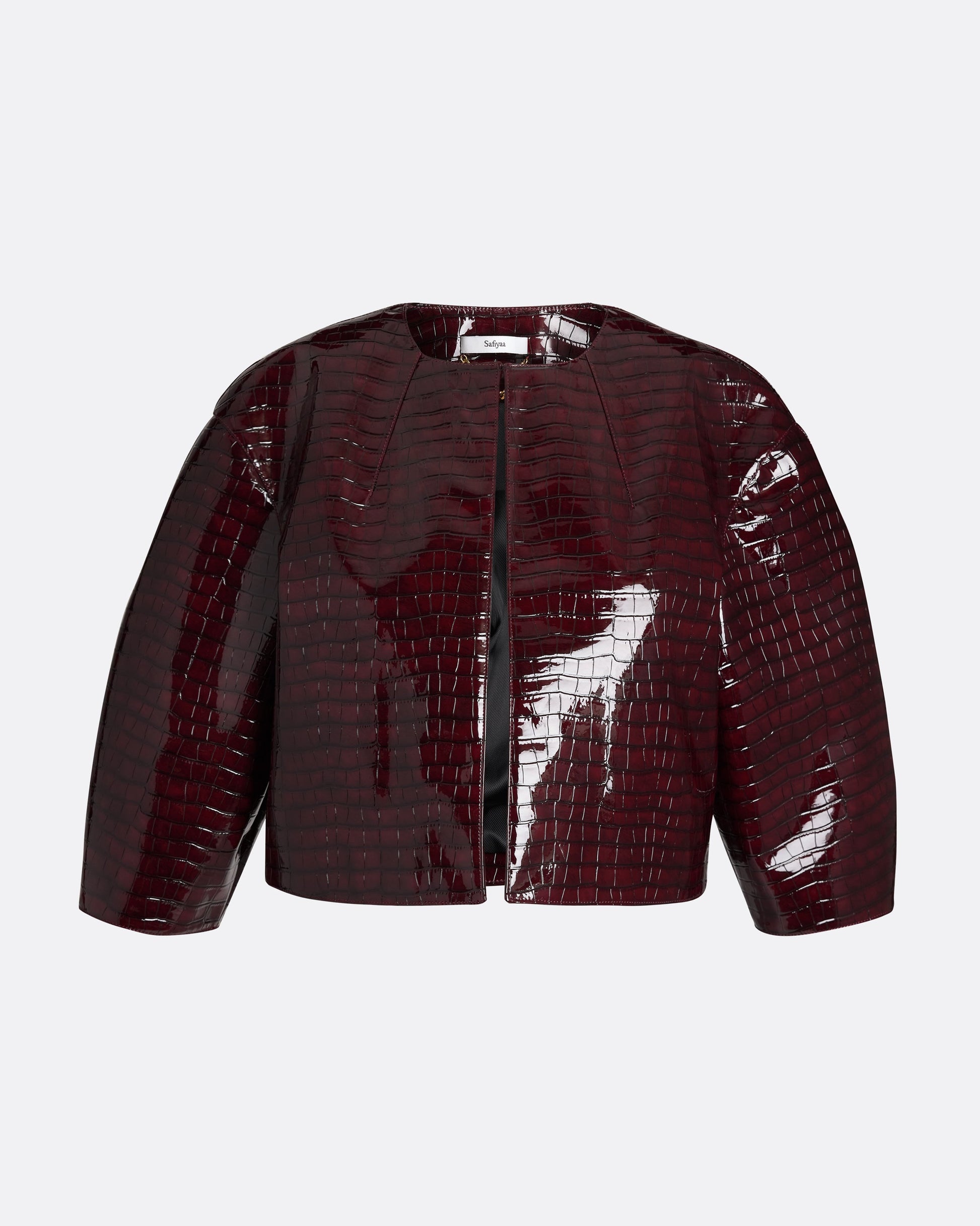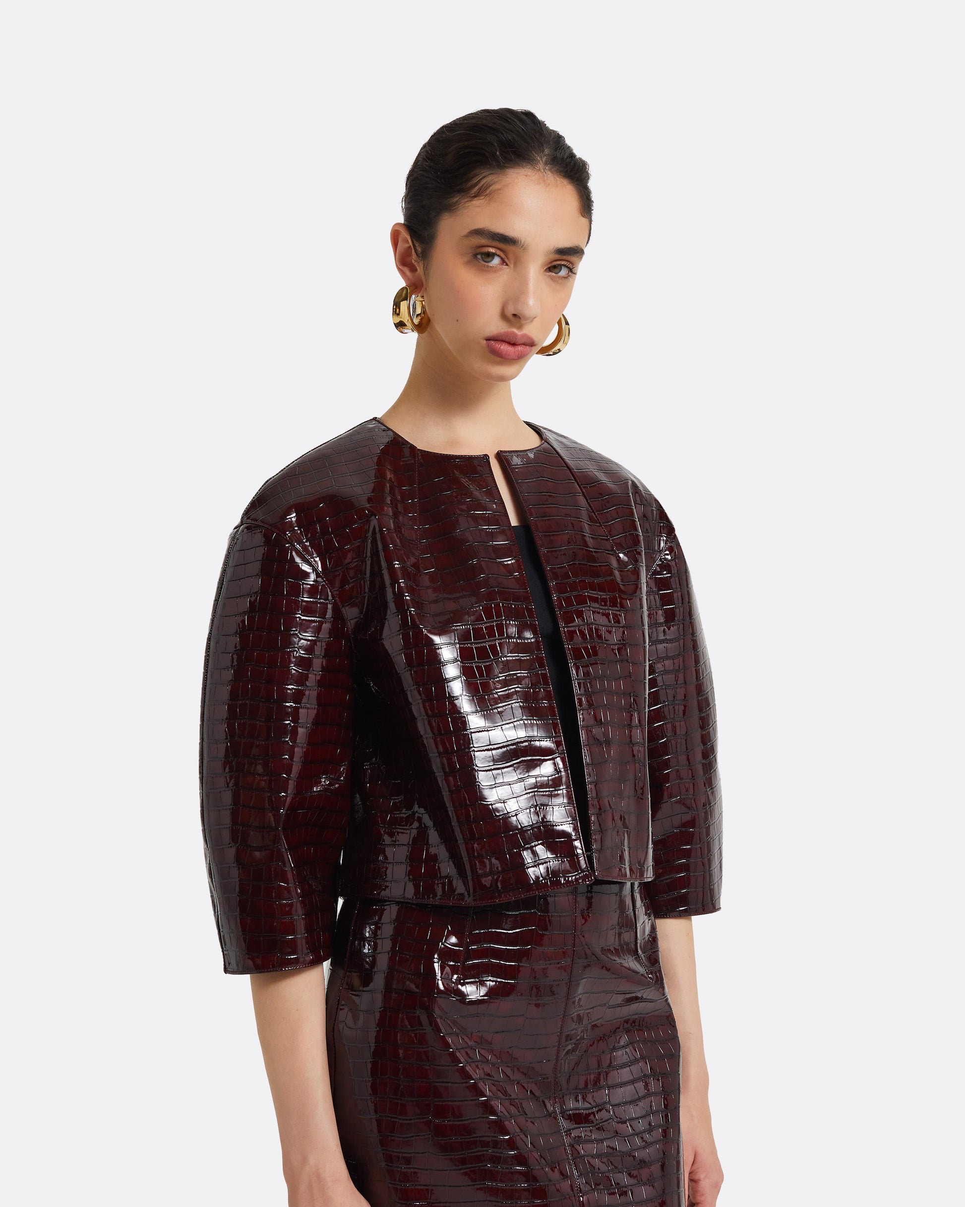 Cropped collarless jacket with round neckline in burgundy Patent Faux Croc.